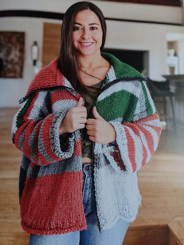 J’aime beaucoup ce gilet avec une fermeture à glissière. Il possède un large col. Le jeu des rayures et le choix des couleurs en font une pièce vitaminée pour l’hiver. C’est un modèle à manches longues ou l’on peut aisément porter un pull dessous.