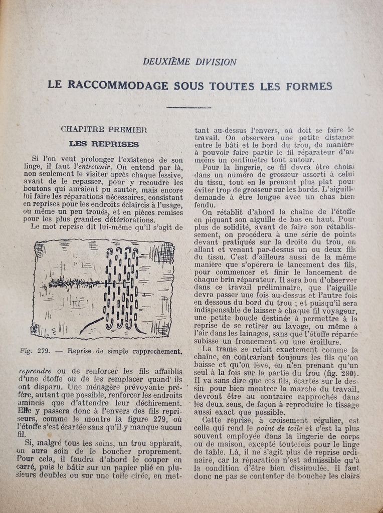 Aujourd’hui, je repartage avec vous une petite bible qui contient de véritables trésors du foyer, pour le linge et les vêtements. Elle date de 1928, et nous condense tout ce que l’on peut faire avec une aiguille et du fil. Coudre des vêtements durables, repriser quand c’est nécessaire, entretenir sa garde-robe. Nos grand-mères faisaient des merveilles pour maintenir en état leurs vêtements et ceux de leurs enfants. Ce livre date de 1928, et comme vous le verrez, c’est une petite merveille !
