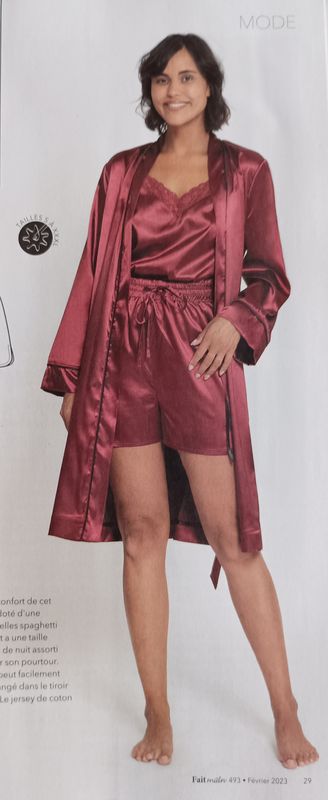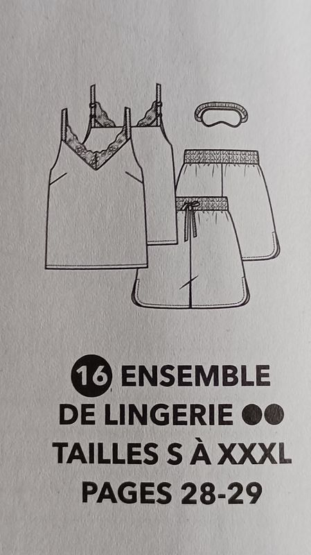 Comme je couds ma lingerie, ce modèle m’a forcément tapé à l’œil, je le vois bien décliné en version été avec une jolie cotonnade. Nous avons un short avec la taille élastiquée et un top à bretelles et encolure en V bordé de dentelles.