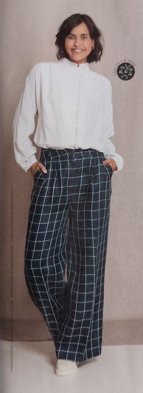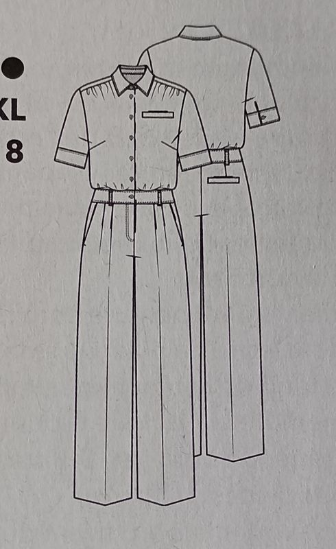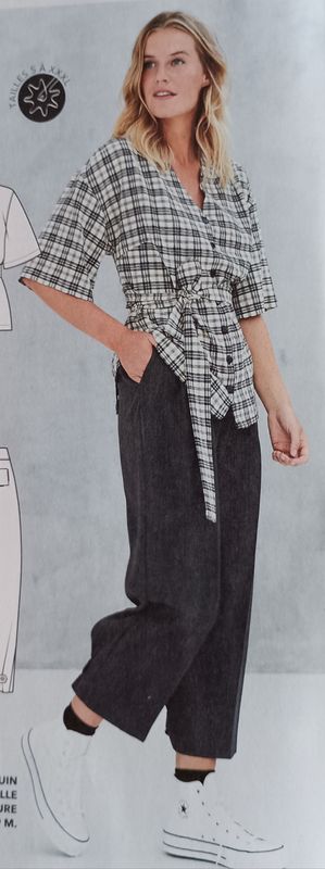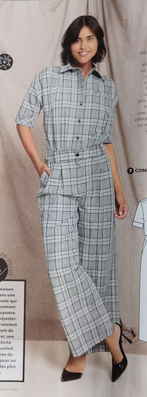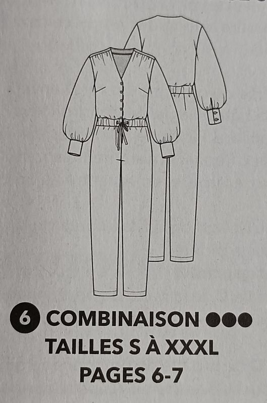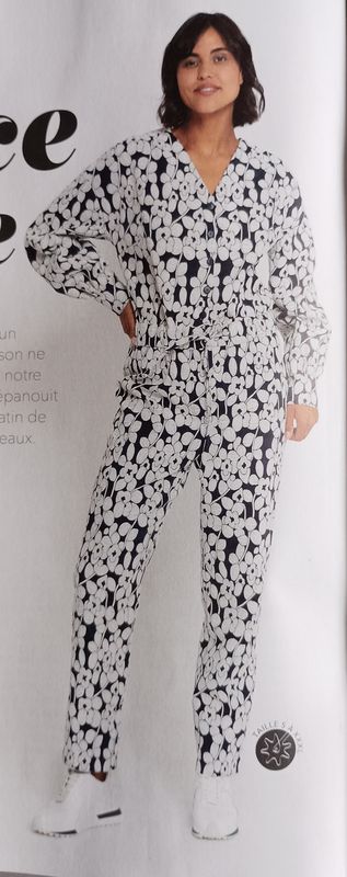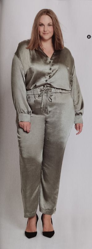 Je n’étais pas fan des combinaisons pantalon jusqu’à ce que j’en essaye une. Bon maintenant, je la porte en pyjama. Mais ce modèle m’a convaincu lorsque je l’ai vu dans le tissu satiné et sur la version en grandes tailles. Le choix du tissu fait beaucoup avec un imprimé, nous avons vite un effet linge de nuit. Ce modèle est près du corps pour la partie pantalon et chemisier blousant pour le haut. L’encolure en V allonge la silhouette visuellement. Les manches sont longues et froncées à leur base resserrées sur un large poignet.