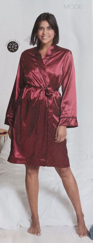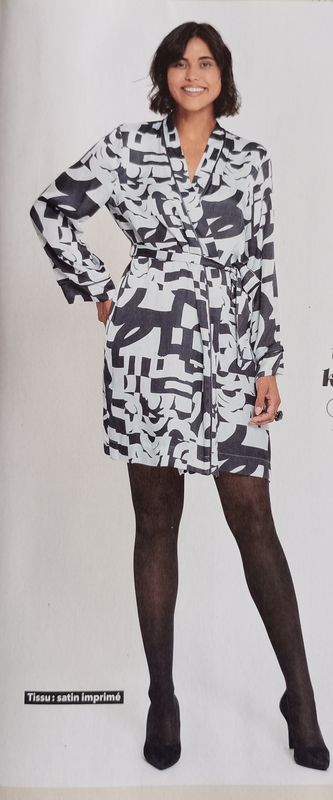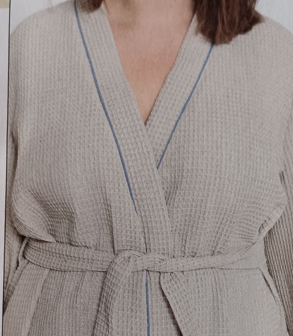 Un joli kimono, et je suis bluffée quant à l’utilisation du patron pour en faire une robe. Des passepoils et des parements soulignent les bords du vêtement. Une ceinture à nouer vient compléter l’ensemble.