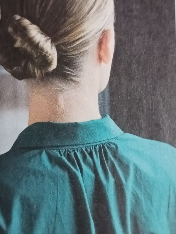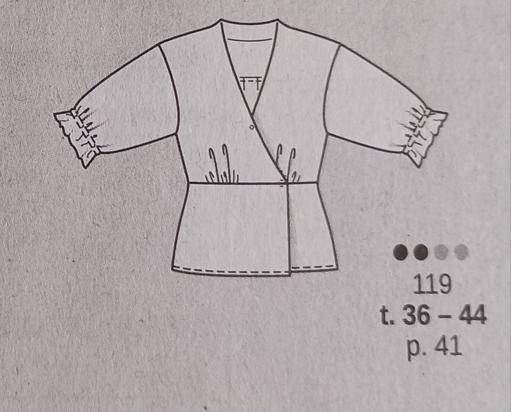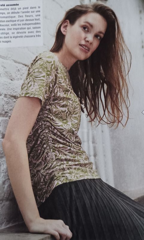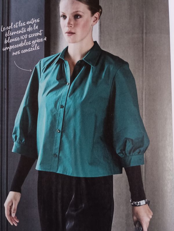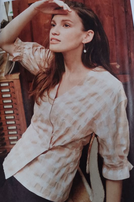 Dernier coup de cœur pour ce chemisier cache-cœur. Il possède des manches trois quarts terminées par un élastique sous coulisse à distance de l’ourlet, formant ainsi un petit volant.