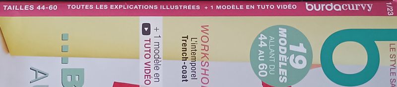 J’ai failli rater ce bandeau, dans la pliure. Il résume la revue, Burda Curvy sans espace. Dans les tailles 44 au 60, avec des explications illustrées. Elles sont plus complètes et détaillées que dans les numéros paraissant chaque mois. Ces derniers ont une amplitude de tailles allant jusqu’à 44. Et quelques modèles allant eux jusqu’au 48. Nous avons aussi un tuto en vidéo.