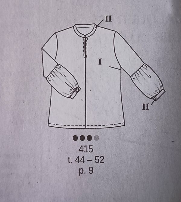 J’aime beaucoup cette tunique, par son volume qui permet de se sentir à l’aise, mais aussi l’allure générale. La large encolure ronde est bordée d’un parement contrastant. Qui peut d’ailleurs être reporté aussi au bas des manches longues. L’ourlet est incurvé.