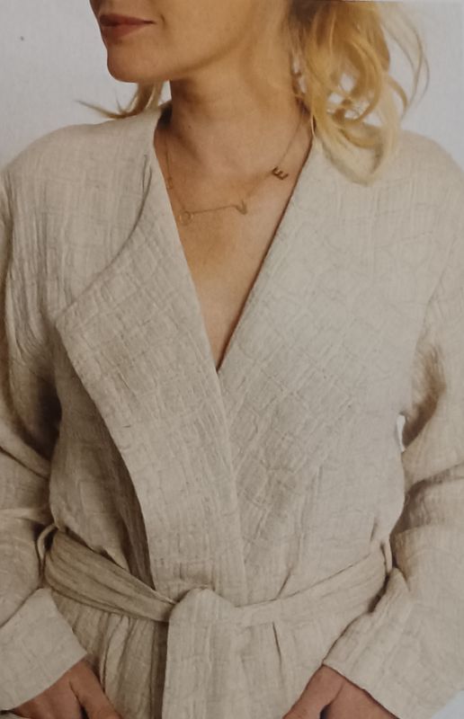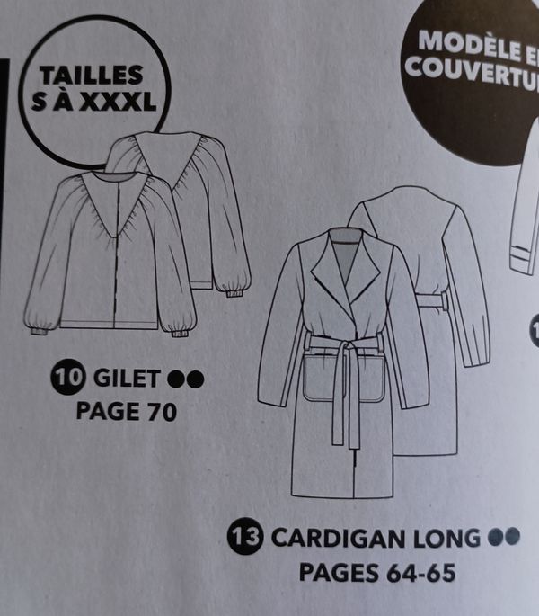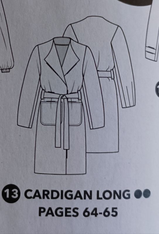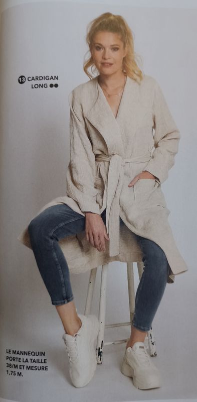 Xe cardigan long m’a plu, car présenté aussi sur un mannequin en grandes tailles. Il se porte fermé à l’aide d’une ceinture.