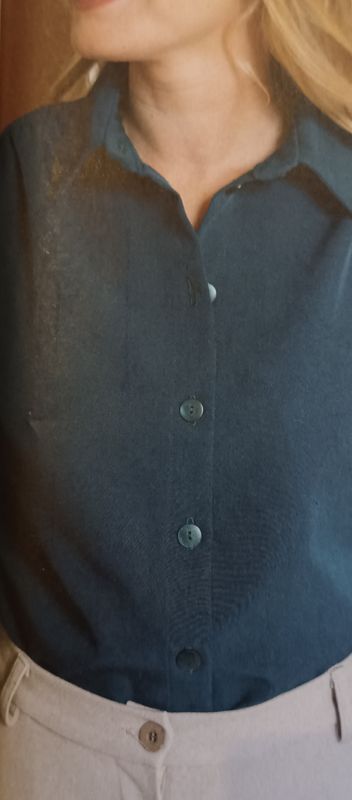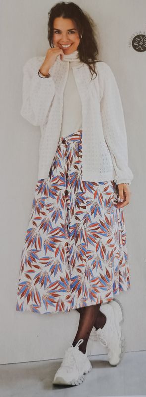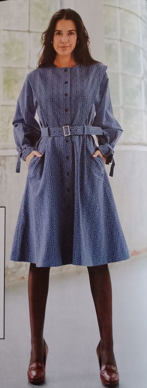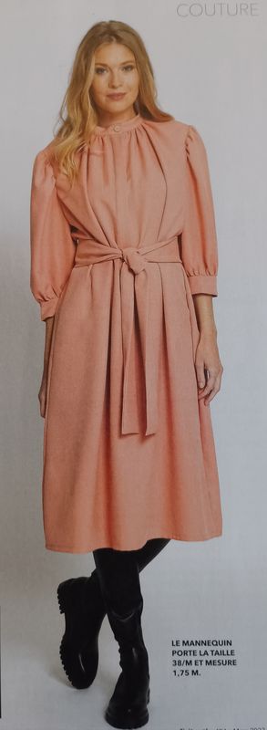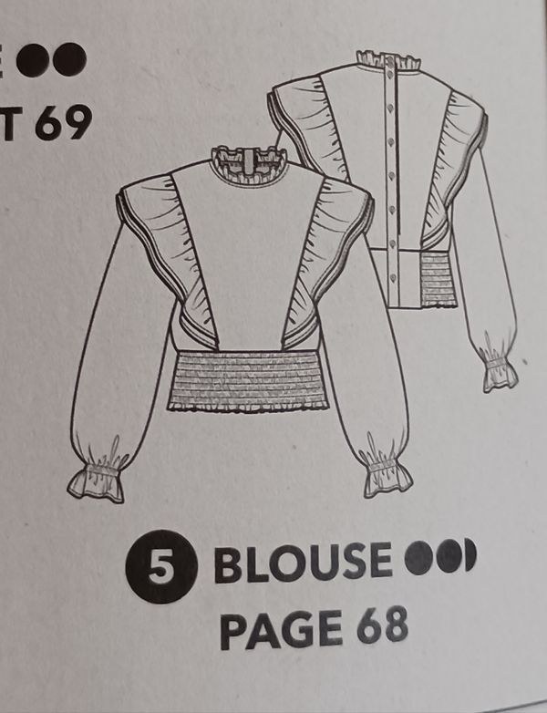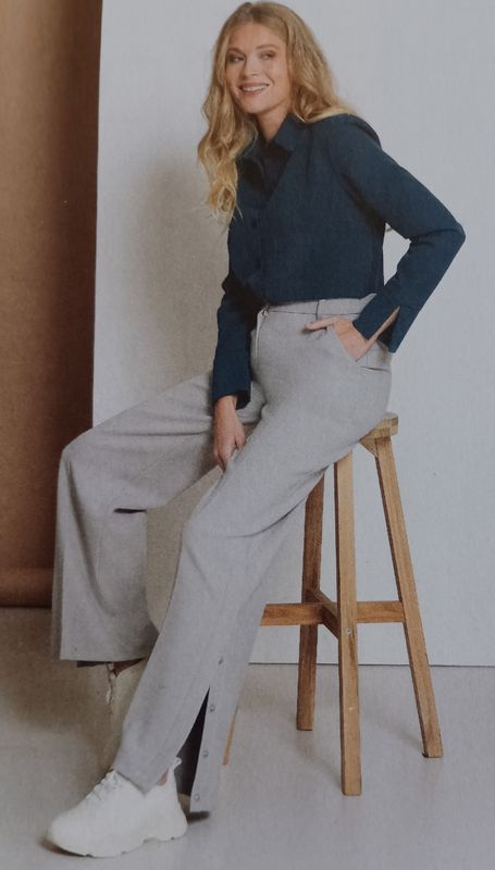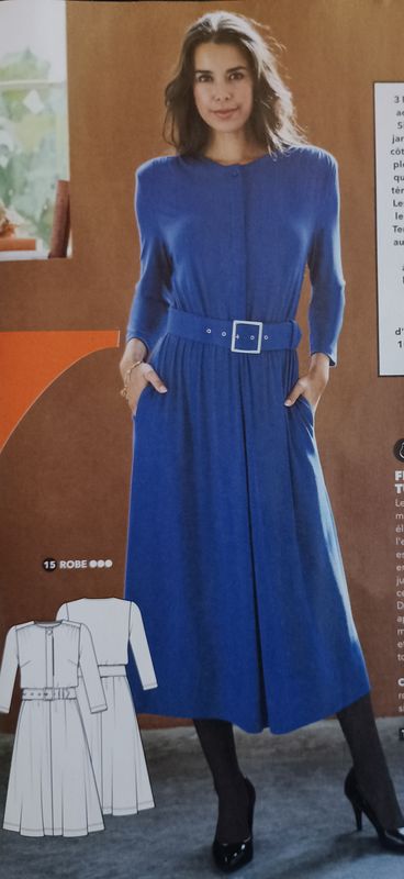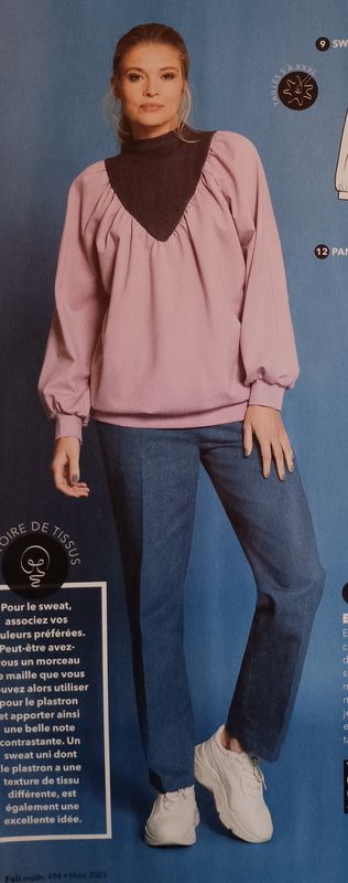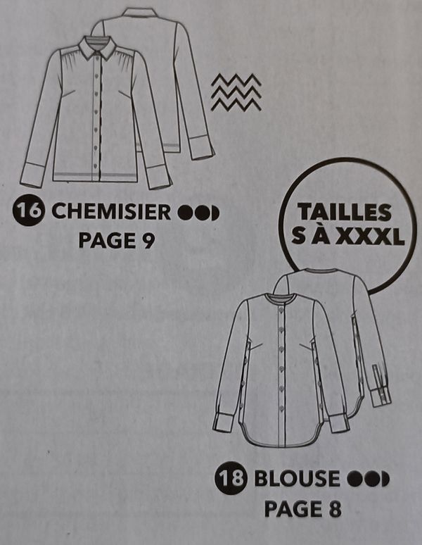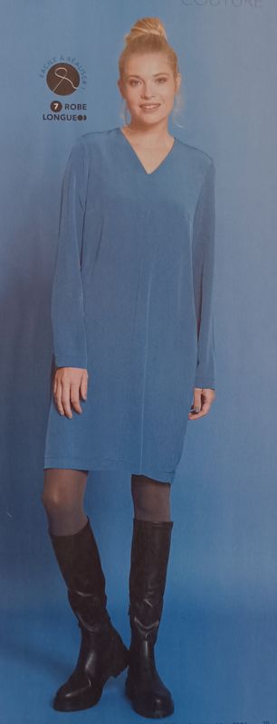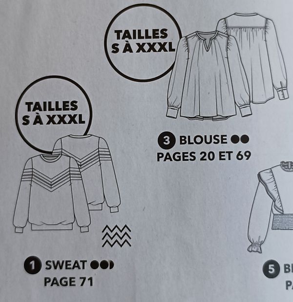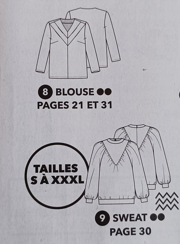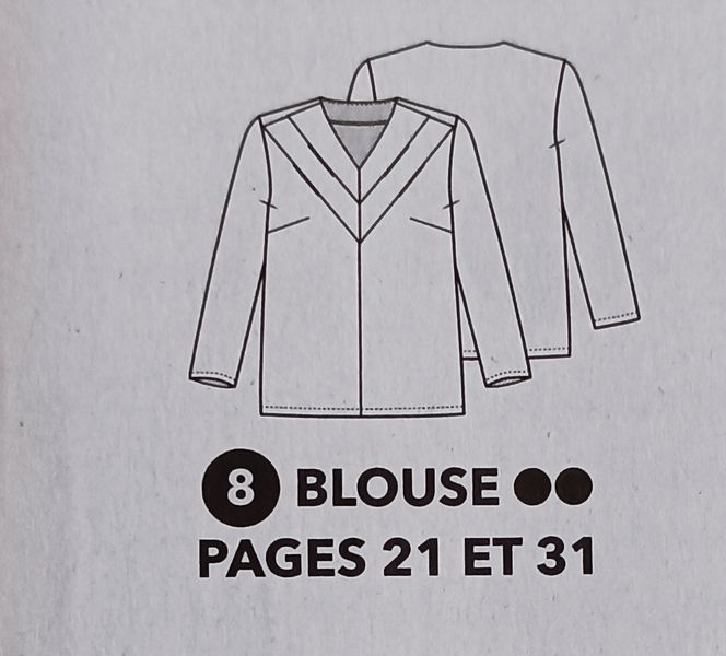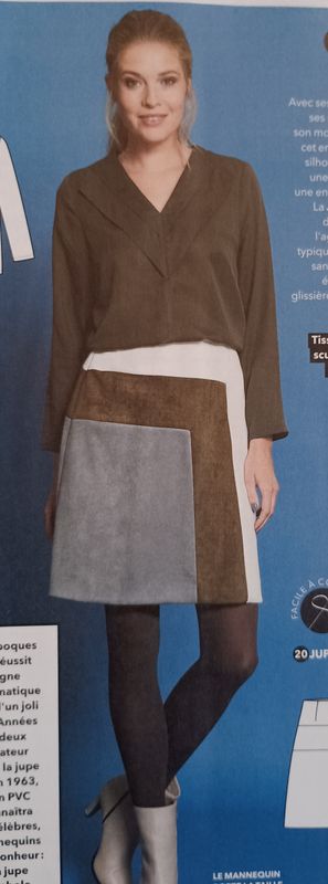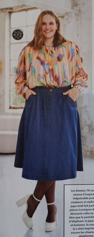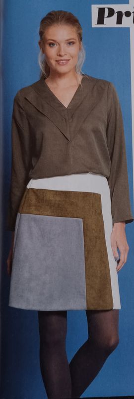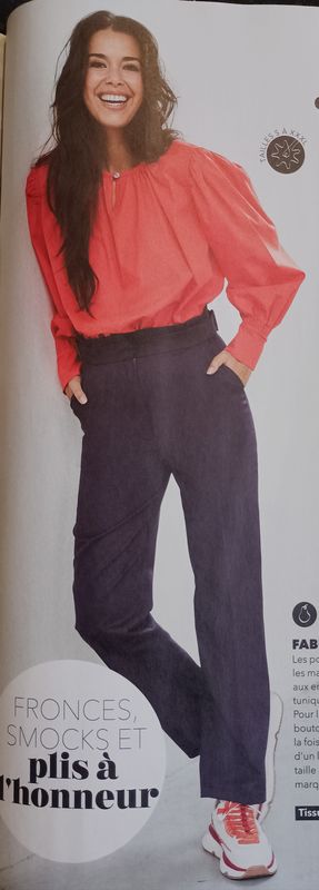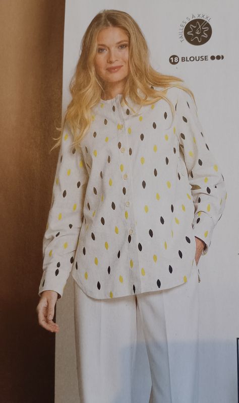 J’aime beaucoup cette blouse à manches longues que l’on retrouve sur un mannequin portant du 50 en dessous. Je pense que les parements d’encolure pourraient être réalisés dans des tissus contrastants. Le résultat pourrait être intéressant.