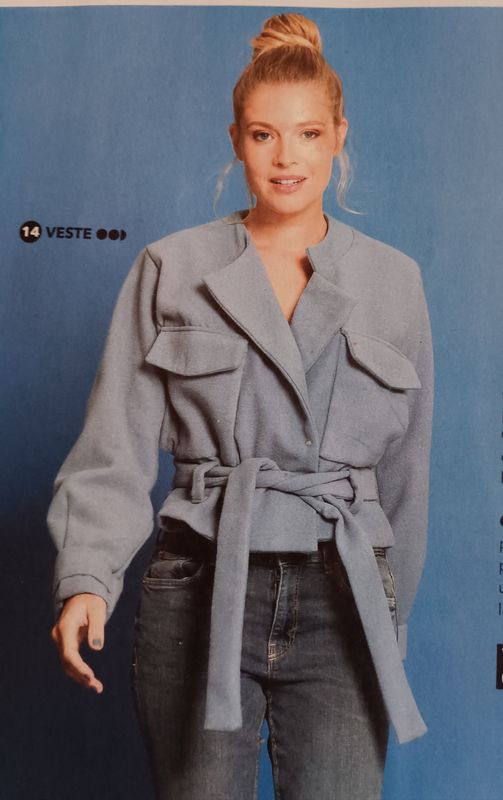 J’adore cette petite veste courte. Elle me fait penser aux vestes anglaises courtes de la seconde guerre avec ses grandes poches. Mais le point de mire est cette encolure asymétrique ! Les manches sont longues.