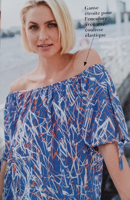 J’adore les tuniques avec les épaules découvertes comme celle-ci. Elle possède des manches fendues, terminées par un petit nœud. L’encolure comporte un élastique sous coulisse qui permet de jouer avec la profondeur de cette dernière.