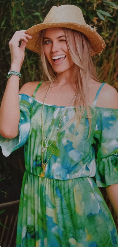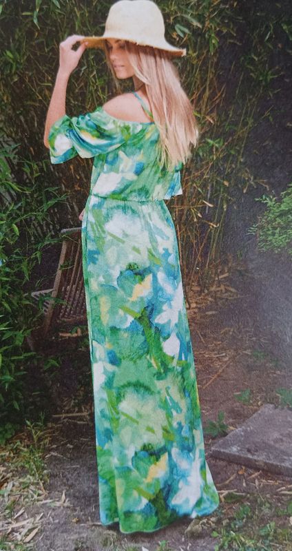 Oui, je sais encore une robe. Elle est jolie non ? De longueur maxi, avec une jupe froncée à la taille à l’aide d’un élastique pris dans la couture. Son point de mire est la large encolure bateau qui dégage les épaules. Un élastique sous coulisse la maintient en place, sécurisé par des petites bretelles. Les manches vont jusqu’aux coudes.
