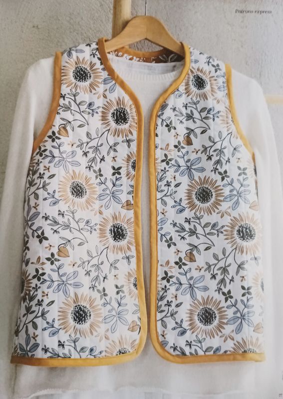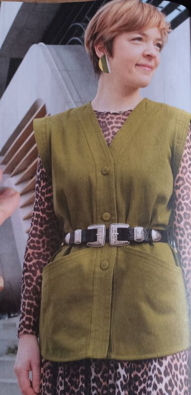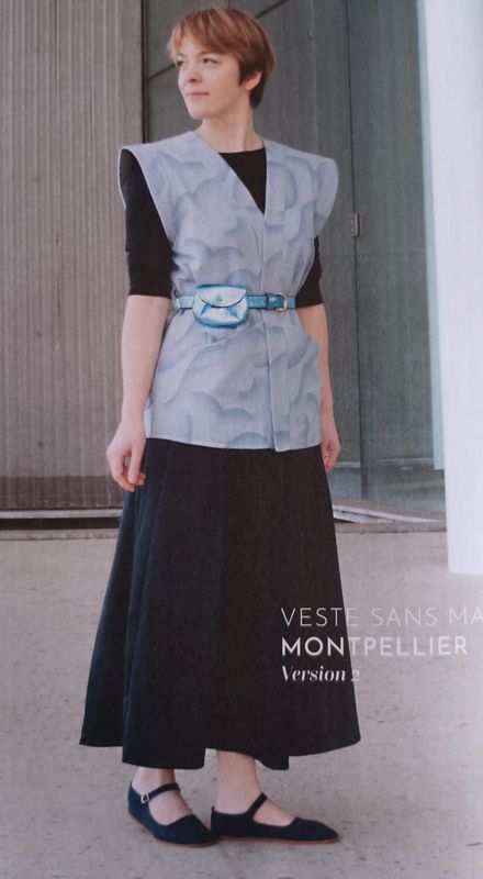 J’aime beaucoup la version avec volant de la veste sans manches. Les grandes poches obliques ajoutent de la fantaisie. Elle se ferme à l’aide d’une ceinture.