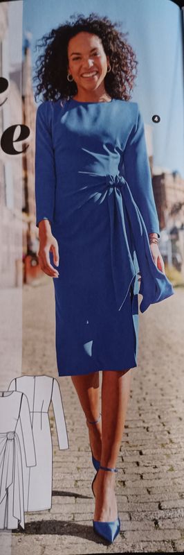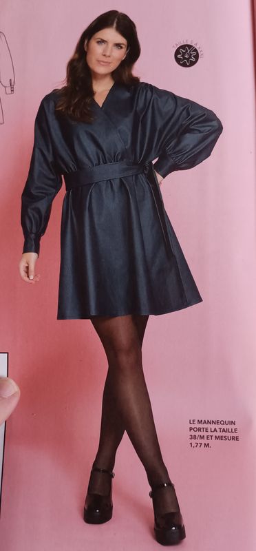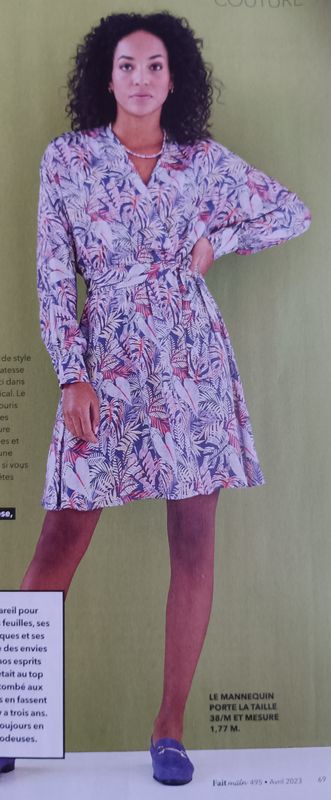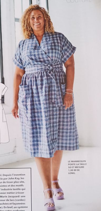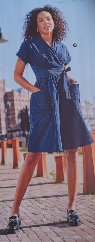 Forcément le modèle de robe d’inspiration vintage est dans mes coups de cœur. Sa réalisation ne présente pas de grandes difficultés. En effet, elle possède de grandes poches plaquées sur la jupe ample. Le haut est de forme cache cœur avec encolure en V. Les manches sont garnies d’un revers. Pour résorber l’ampleur de la robe, une large ceinture nouée vient resserrer la taille.