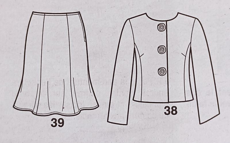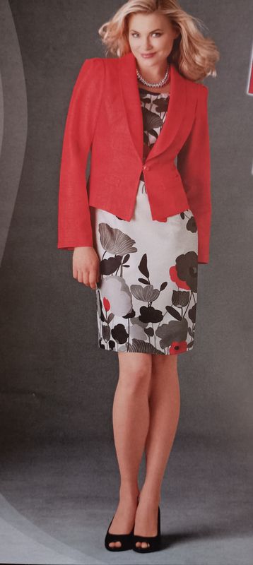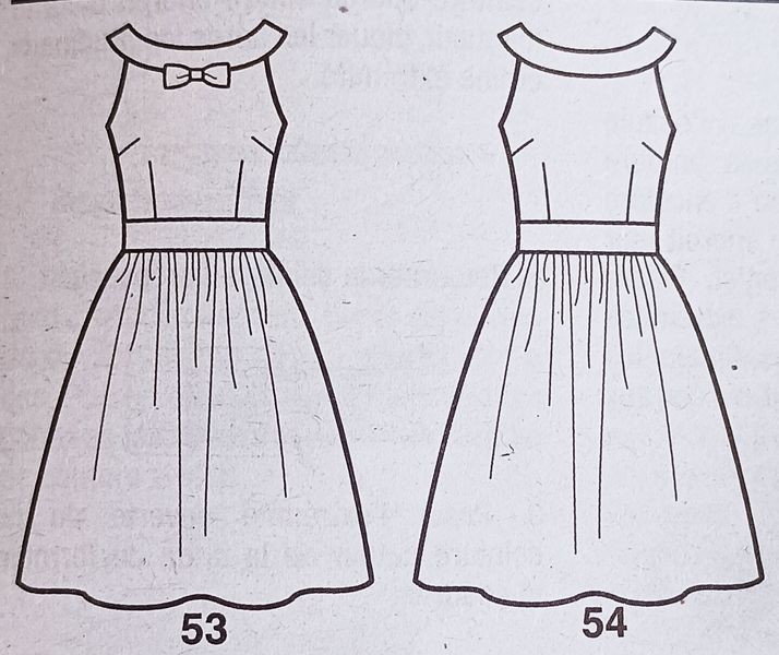 J’adore aussi ce style de pièce d’inspiration vintage, ici des années 50. Nous avons des robes fourreau ou avec une jupe froncée. Un joli parement d’encolure sur un haut ajusté. Une bande de tissu souligne la taille. L’ensemble comporte une petite veste courte, elle aussi, avec un parement d’encolure.