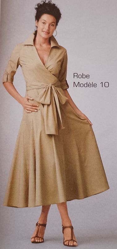 Voici un style de robe que j’aime, c’est-à-dire une forme portefeuille. Elle se noue à la taille avec un gros nœud. La robe possède une belle ampleur, accentuée par des godets. Le buste comporte une grande encolure en V avec un petit col. Les manches peuvent être retroussées à l’aide de la patte de boutonnage.