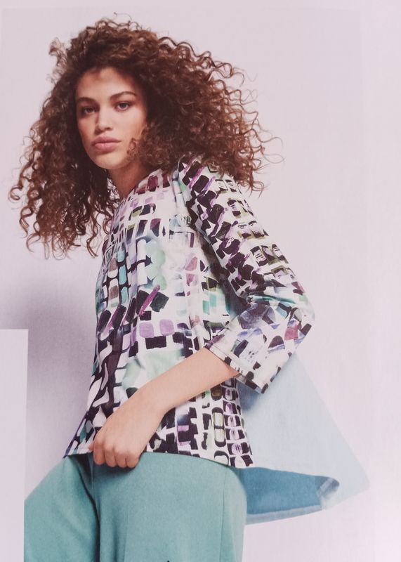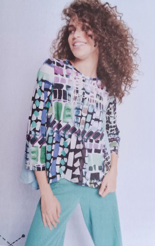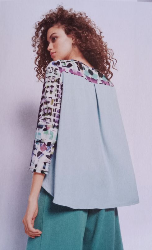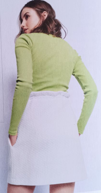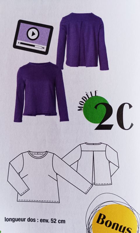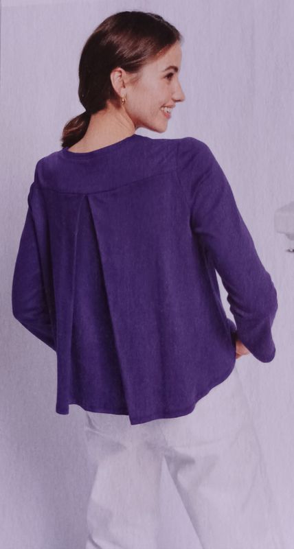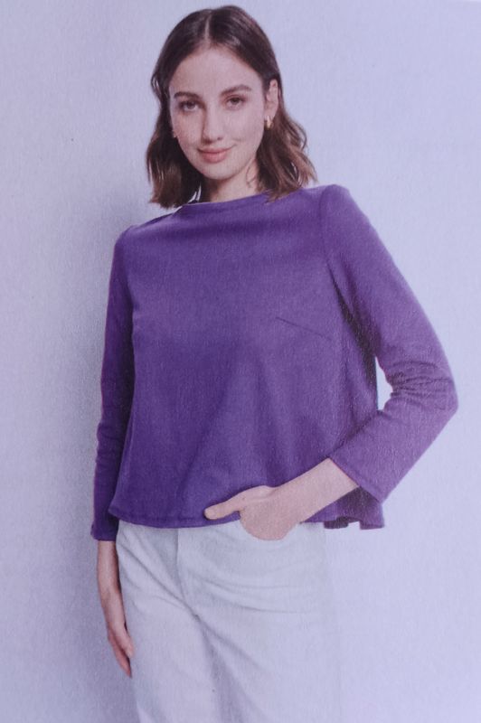 J’aime ce genre de petits pulls légers avec des manches longues ou trois quarts. L’encolure est ronde et bordée d’un biais. Les ourlets sont arrondis, et plus long dans le dos, avec un empiècement et un plus creux. Ce qui permet d’apporter du confort.