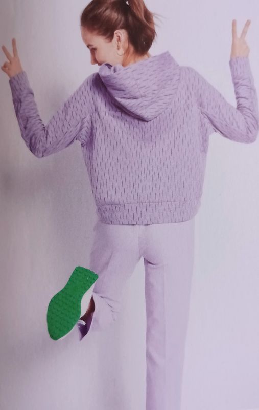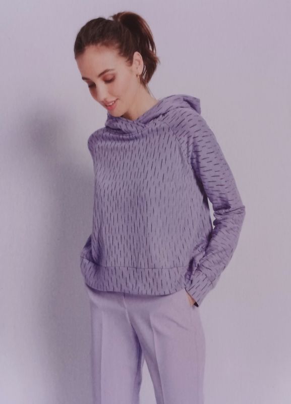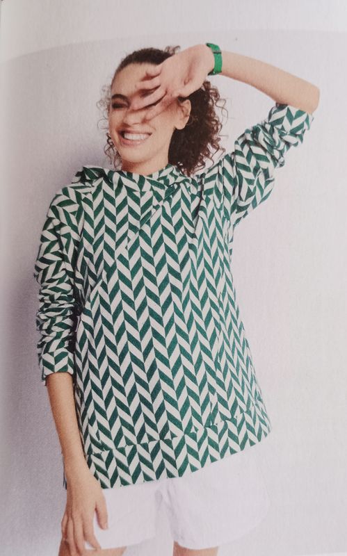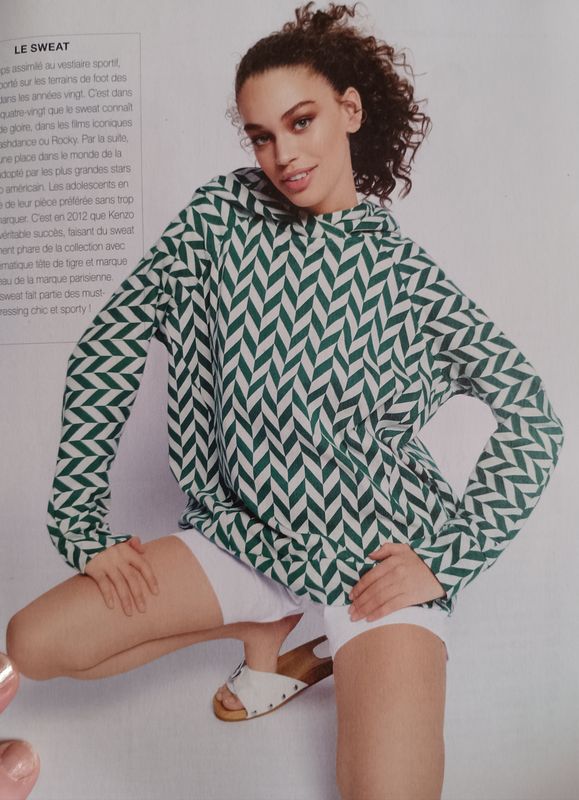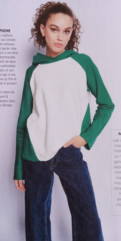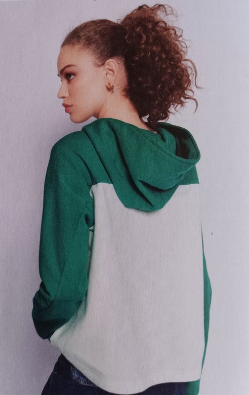 Encore un vêtement avec des manches raglans, mais celui-ci exploite pleinement ce potentiel avec deux tissus contrastants. Nous avons un sweat UNISEXE, qui conviendra aux hommes comme aux femmes. Des découpes sur les côtés viennent compléter cette jolie pièce, ainsi que la capuche.