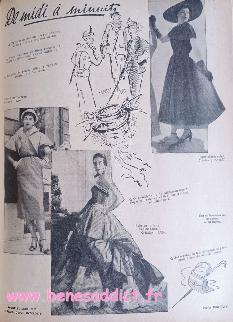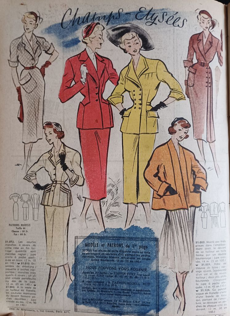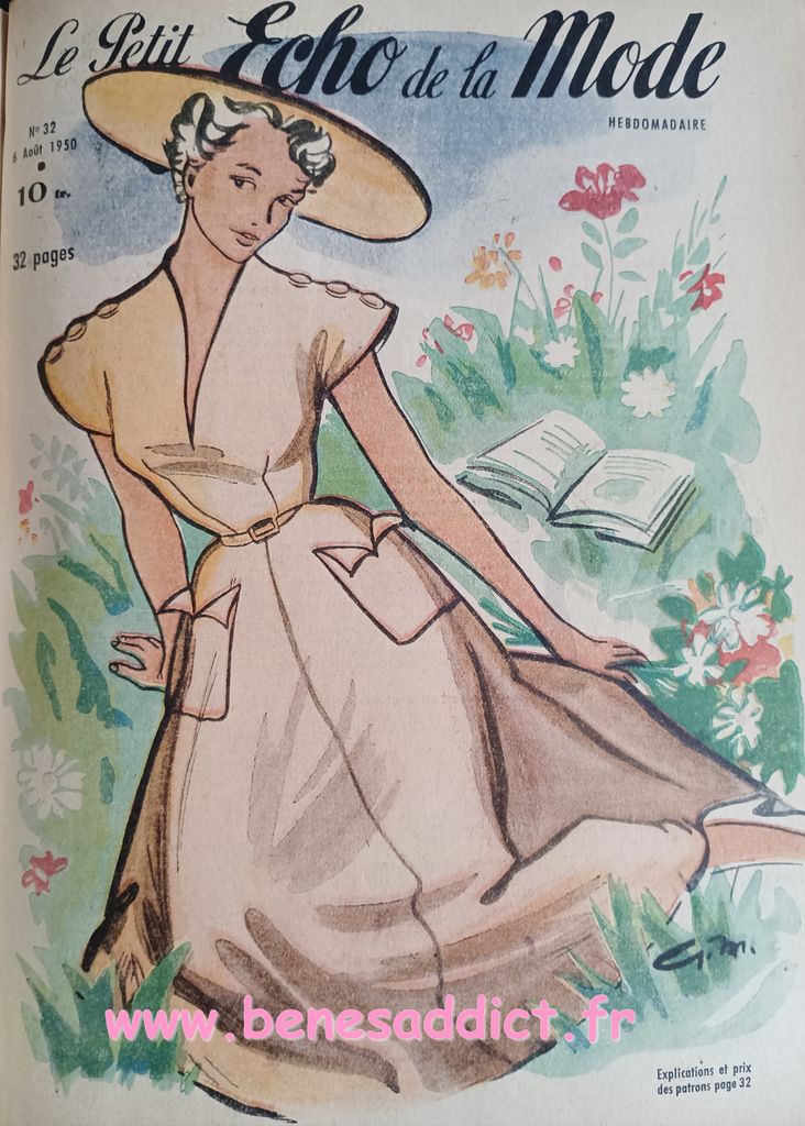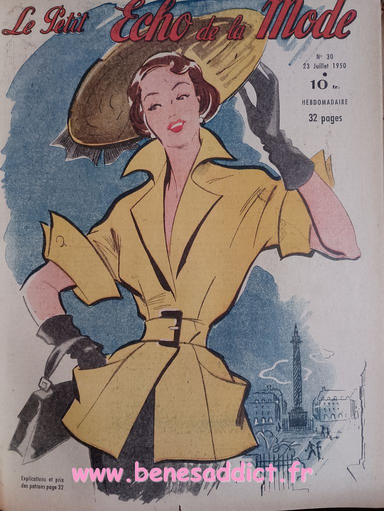 Bonjour, bonjour ! Voici notre rendez-vous hebdomadaire pour les amoureux des Modes d’ antan. Pour quelques instants, vous allez voyager dans le passé. Plus précisément toujours en 1950, avec plusieurs numéros de la revue « Le Petit Echo de la Mode ». Cet ouvrage paraissait chaque semaine. C’était un moment que les femmes et jeunes filles attendaient avec impatience. En effet, étaient présents de nombreux patrons de couture, mais aussi de tricot, même de crochet,ainsi qu’une multitude de recettes de cuisine et d’astuces pour la vie de tous les jours. Tout comme le courrier des lectrices qui abordait tous les problèmes de société féminins, jeunes ou moins jeunes. L’ancêtre des forums d’aujourd’hui.