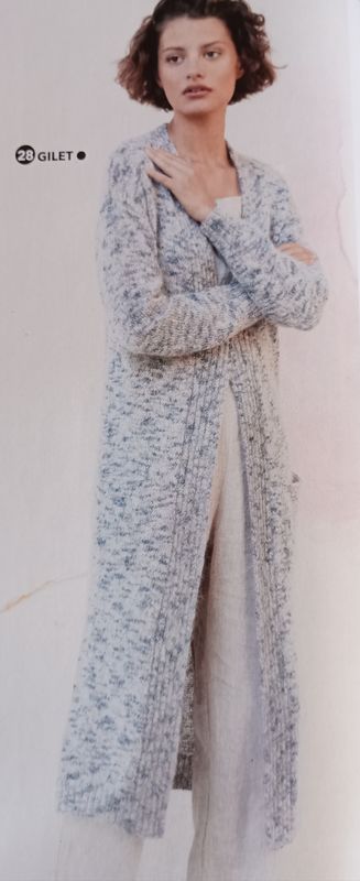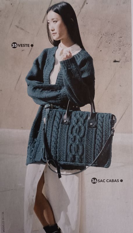 Je trouve les longs gilets très pratiques, ils habillent rapidement une silhouette. Les structures en reliefs habillent la tenue. Ils sont rappelés sur le sac cabas, qui trouve un côté cosy.
