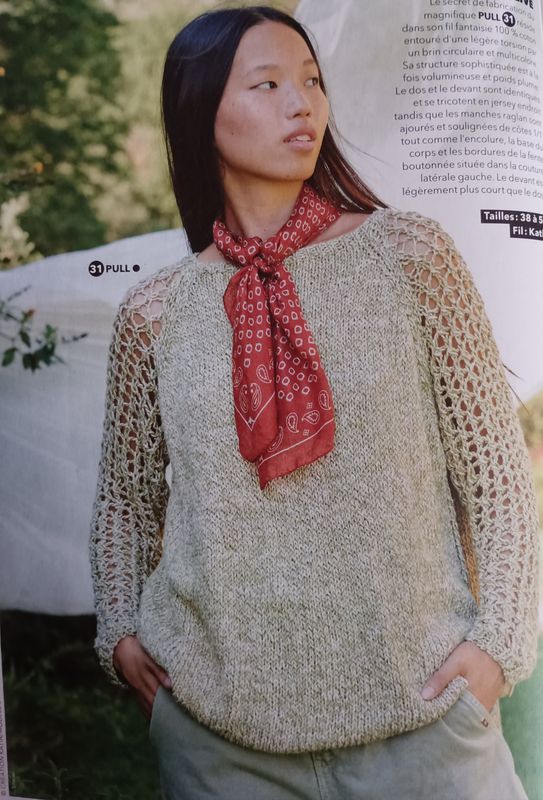 Le côté vintage de ce pull me plait beaucoup. Le choix de la couleur, mais aussi la taille et le fil structuré donne une légère transparence. Cela permet de voir la structure des manches raglans. La lavallière étant double, elle parait elle plus lumineuse.