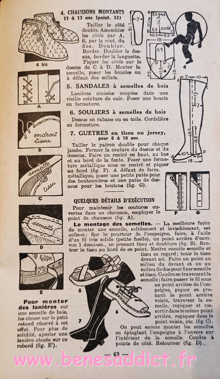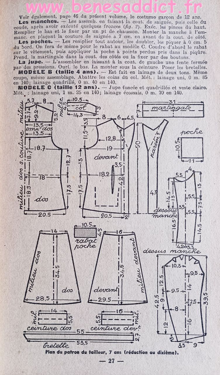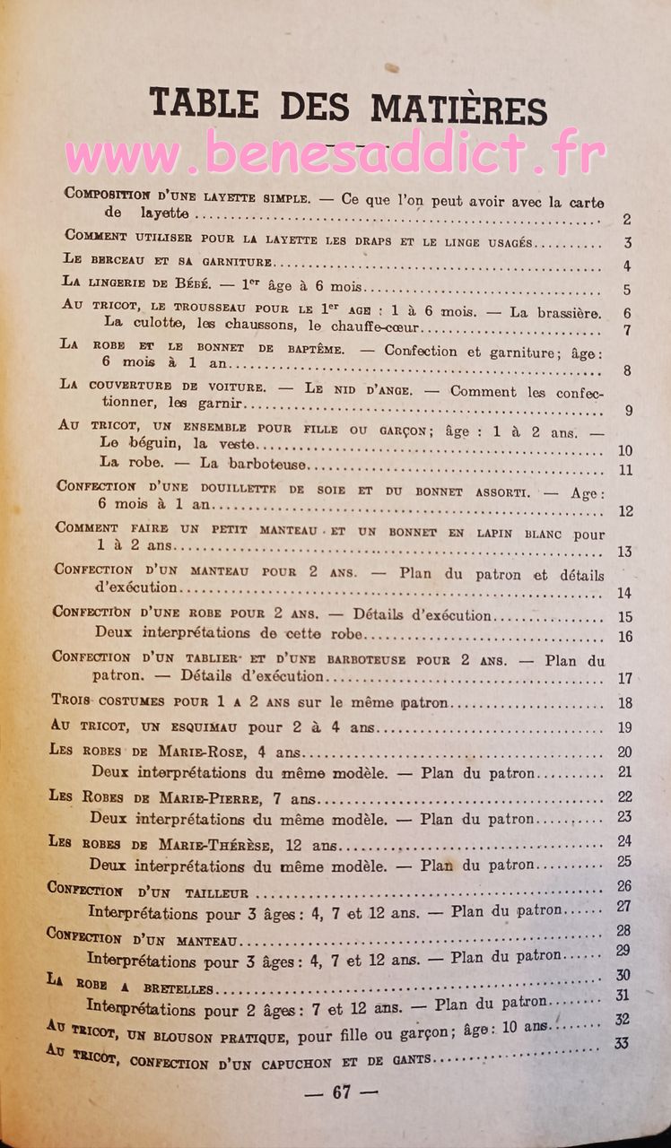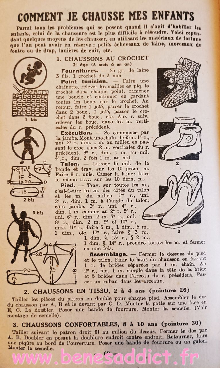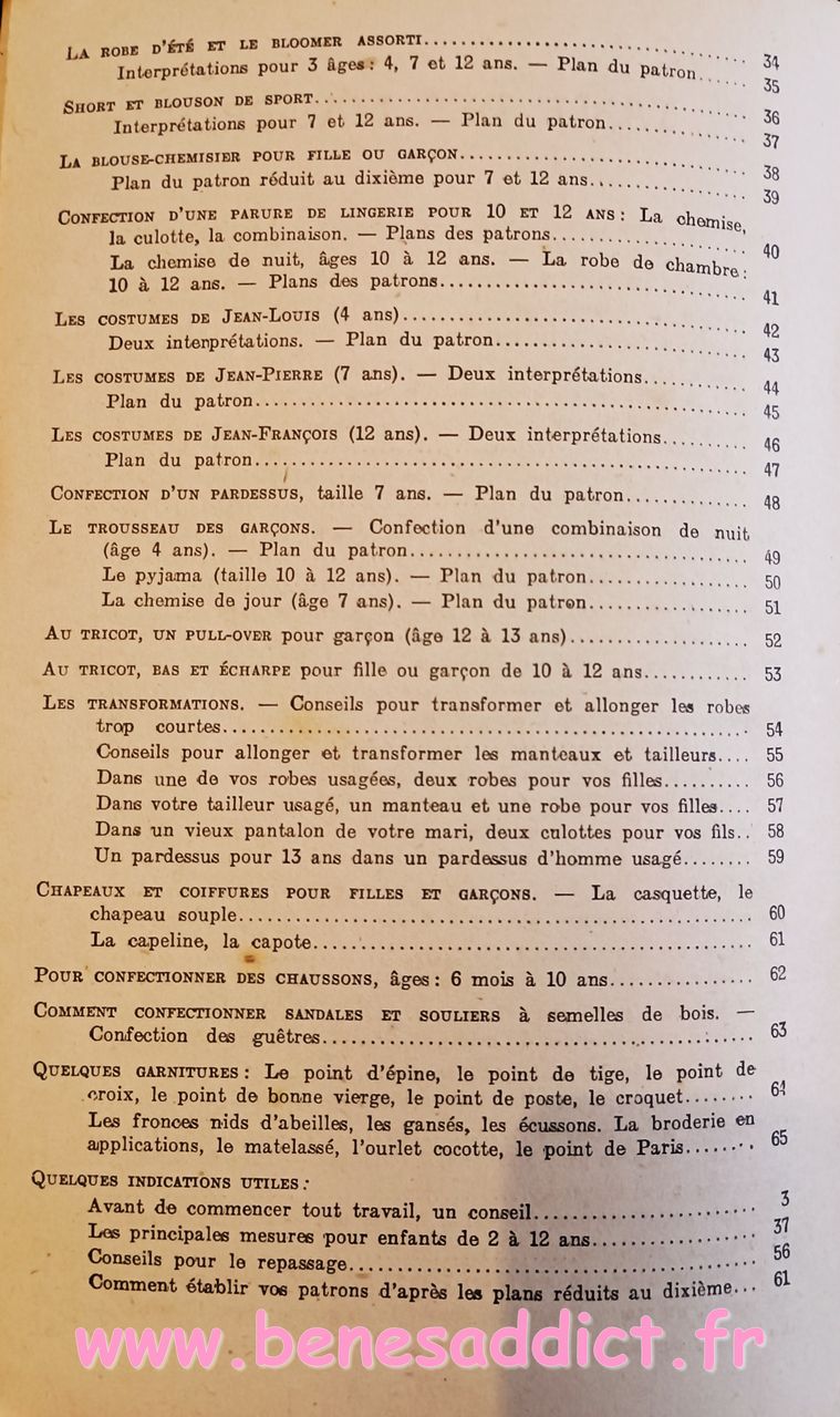 Donc ce petit Livret de plus de soixante pages nous enseigne l’art d’habiller les enfants. Plus précisément, il contient une soixantaine de patrons de couture, et quelques modèles à tricoter de la naissance à douze ans. Mais aussi des astuces pour transformer les vêtements, et même pour réaliser des chaussures pour les petites têtes blondes. Que l’on peut maintenant transposer pour adultes aussi.
