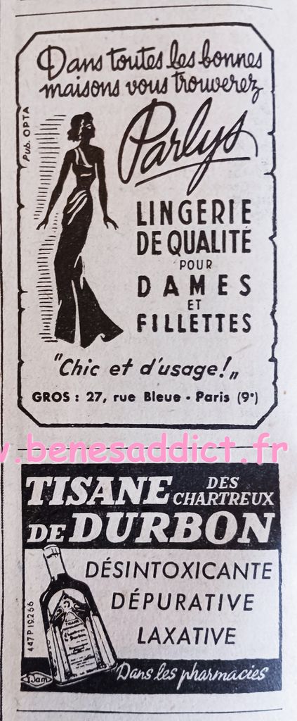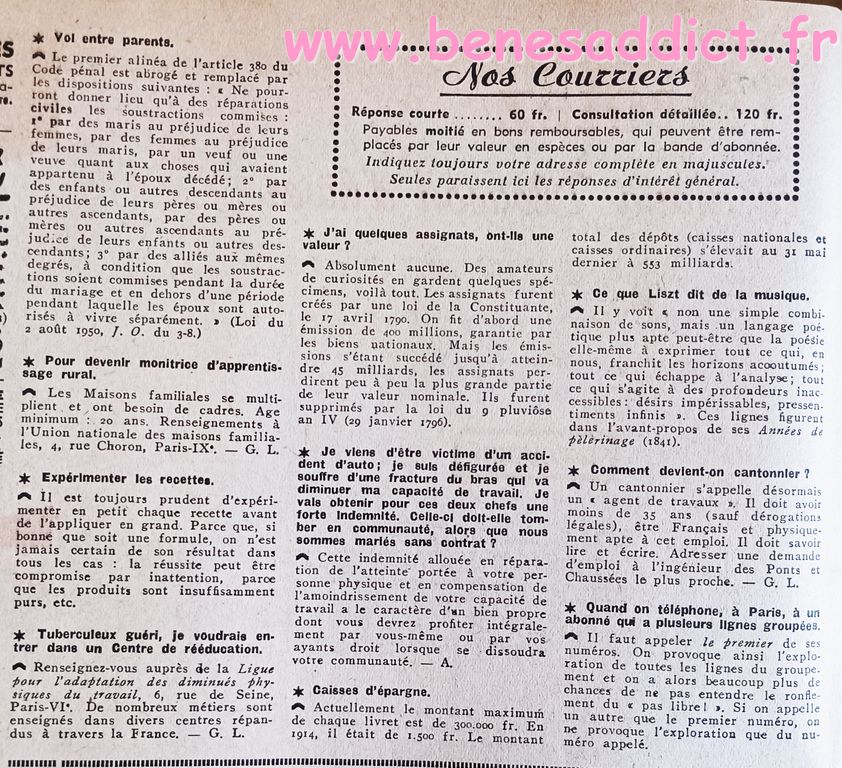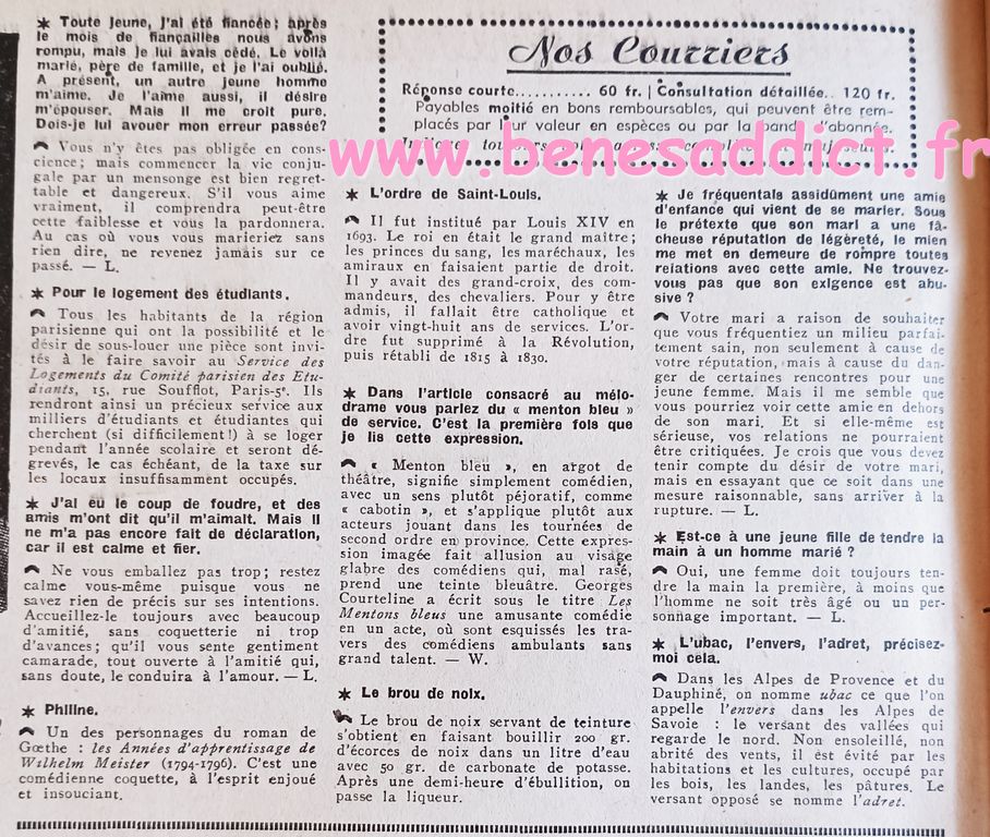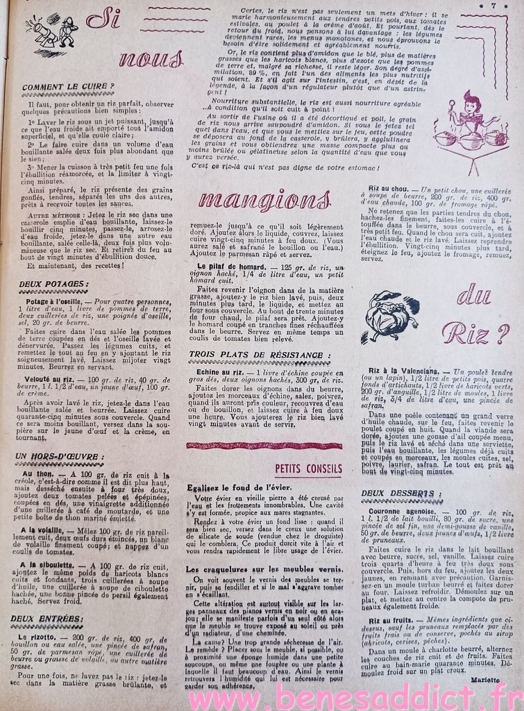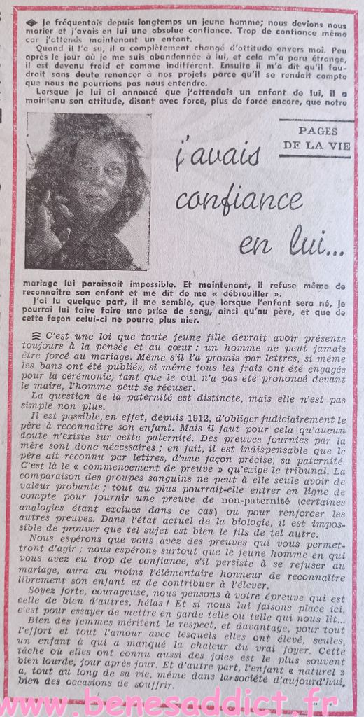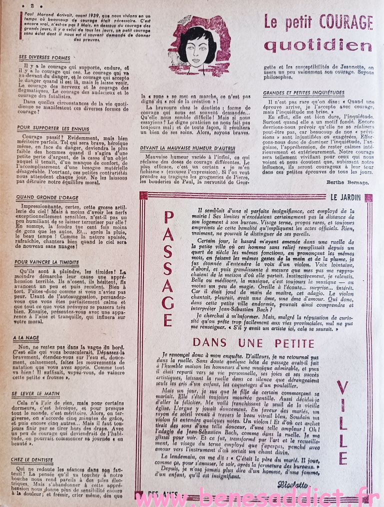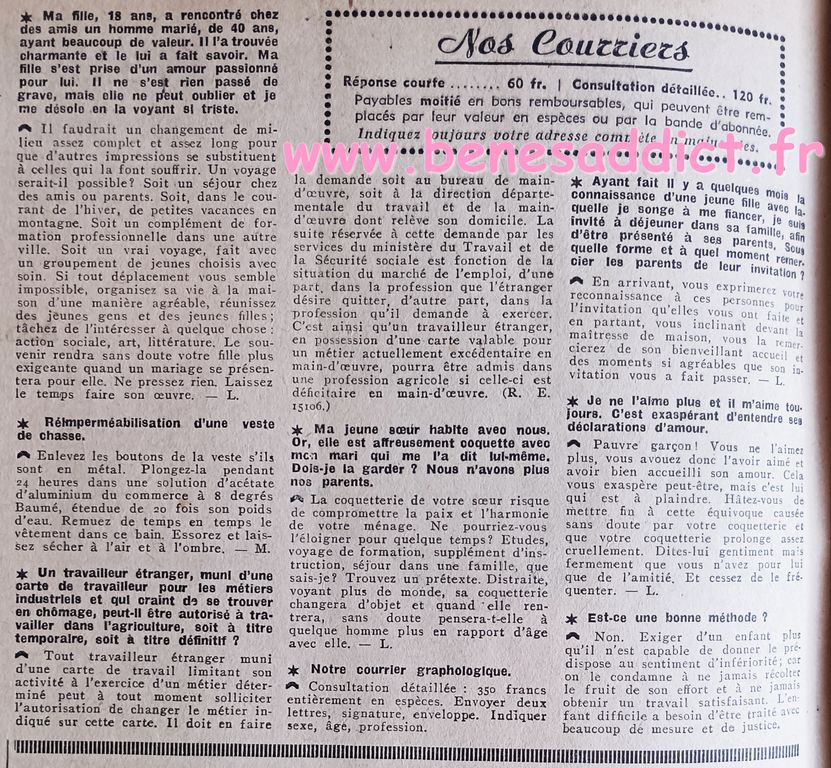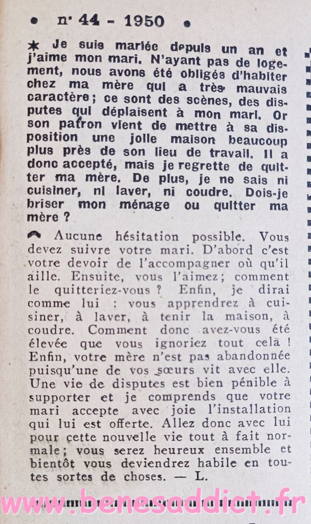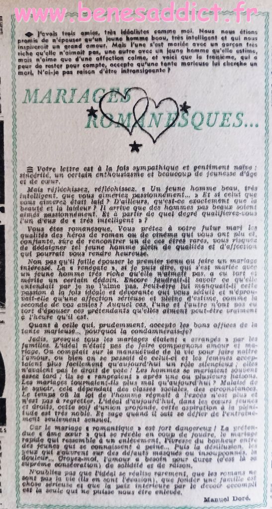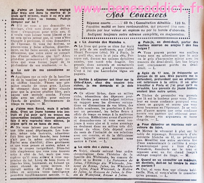 Les réclames se répètent souvent d’un numéro à l’autre, témoins d’une époque révolue… Plongeons dans la lecture du courrier du cœur, qui, quelques fois, me fait peine à lire… Nos mentalités ont bien changé, les femmes ont de nos jours la liberté de faire leurs choix de vies. Même s’il y a encore beaucoup de chemin à faire… L’éducation que nous donnons à nos filles a, elle aussi, bien évolué, nous leur apprenons à être indépendantes et faire ce qu’elles aiment. Leur donner surtout aussi les clefs pour être heureuses dans leurs vies.
