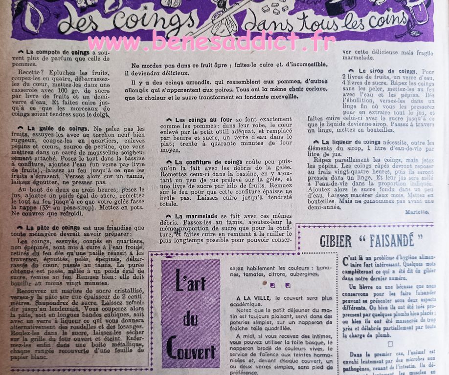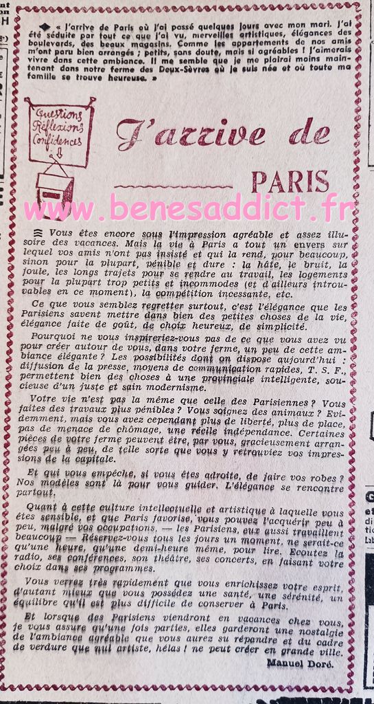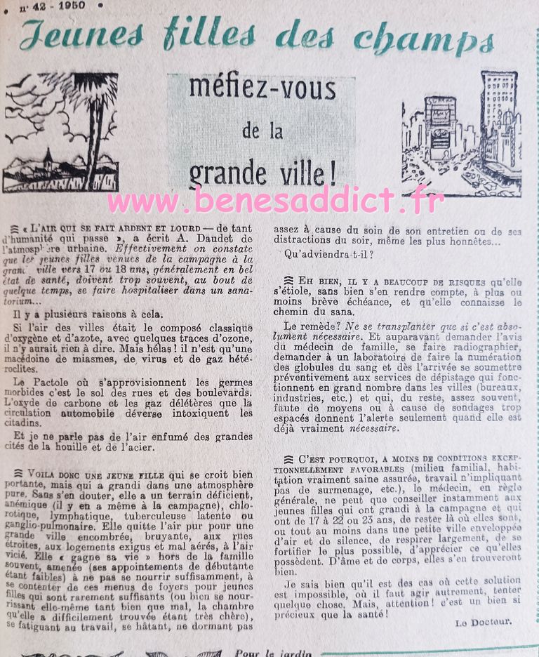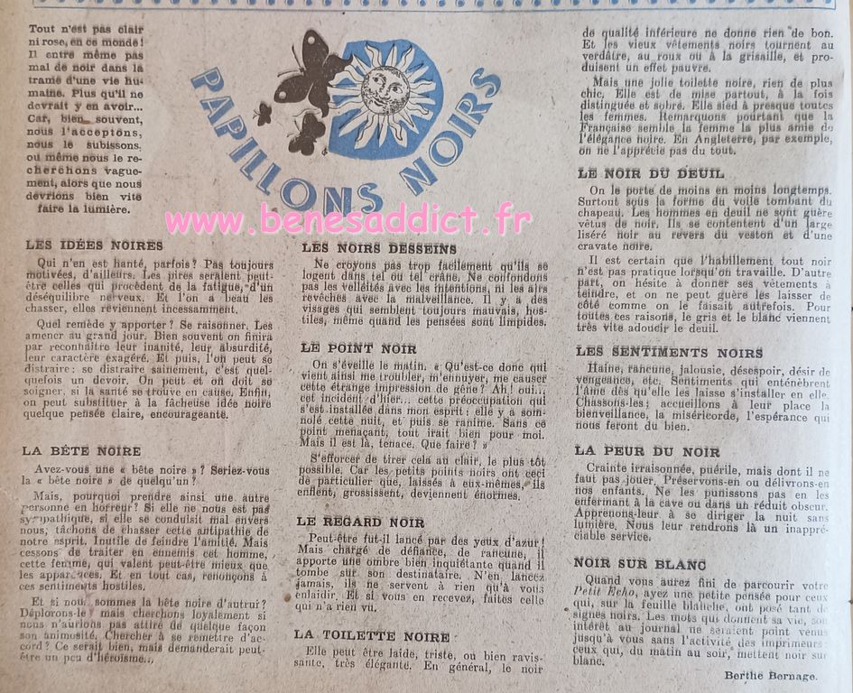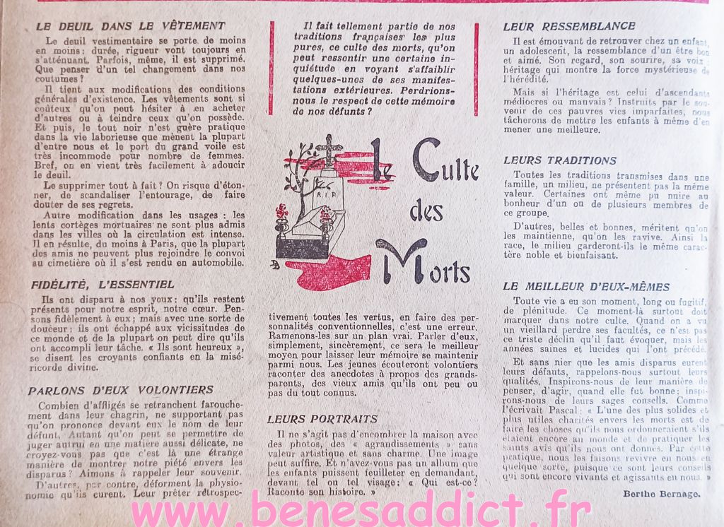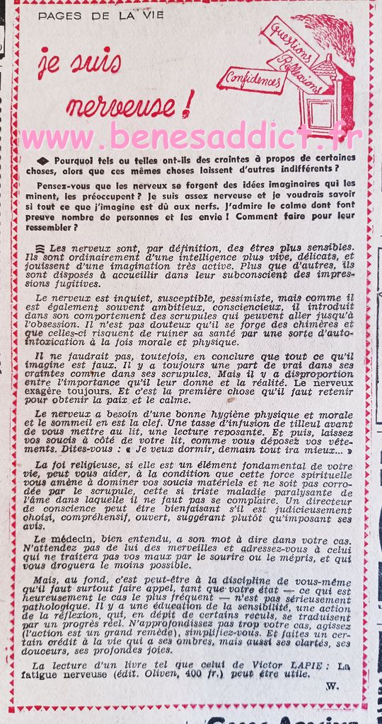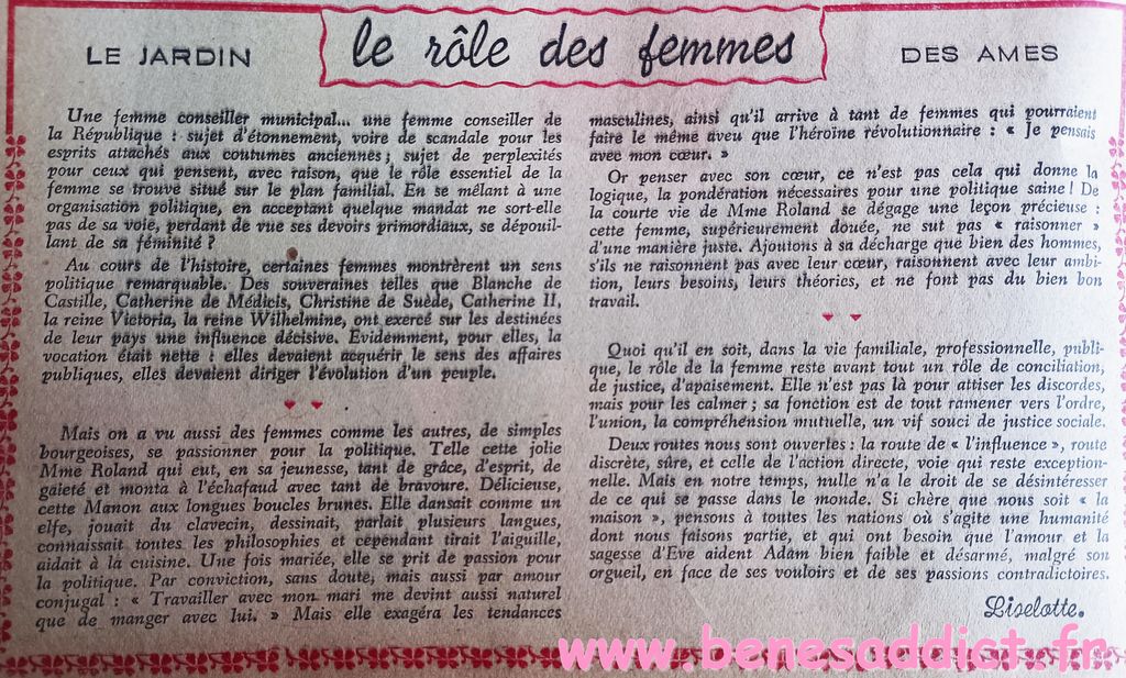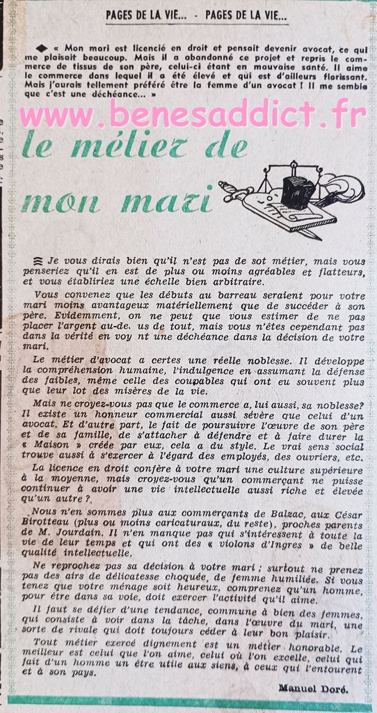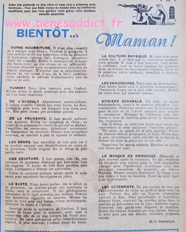 Les réclames se répètent souvent d’un numéro à l’autre, témoins d’une époque révolue… Plongeons dans la lecture du courrier du cœur, qui, quelques fois, me fait peine à lire… Nos mentalités ont bien changé, les femmes ont de nos jours la liberté de faire leurs choix de vies. Même s’il y a encore beaucoup de chemin à faire… L’éducation que nous donnons à nos filles a, elle aussi, bien évolué, nous leur apprenons à être indépendantes et faire ce qu’elles aiment. Leur donner surtout aussi les clefs pour être heureuses dans leurs vies.