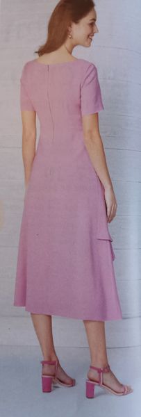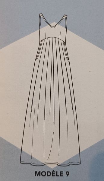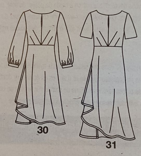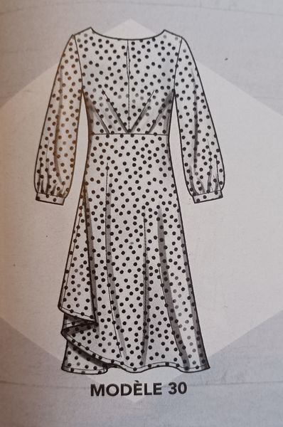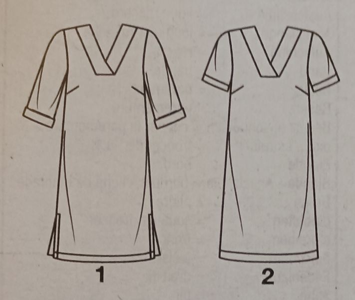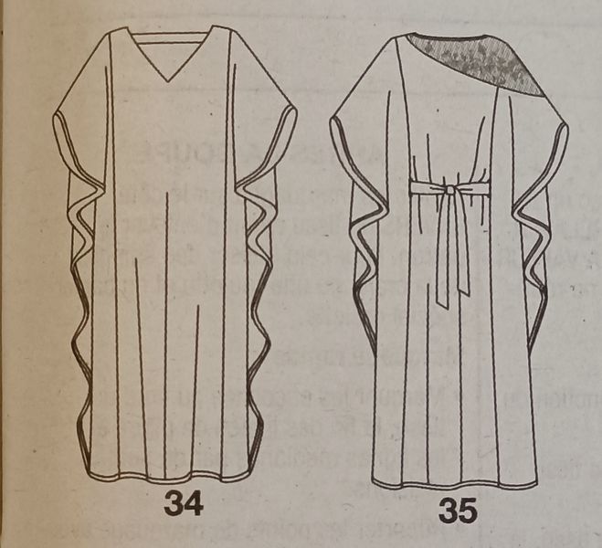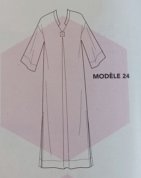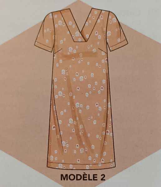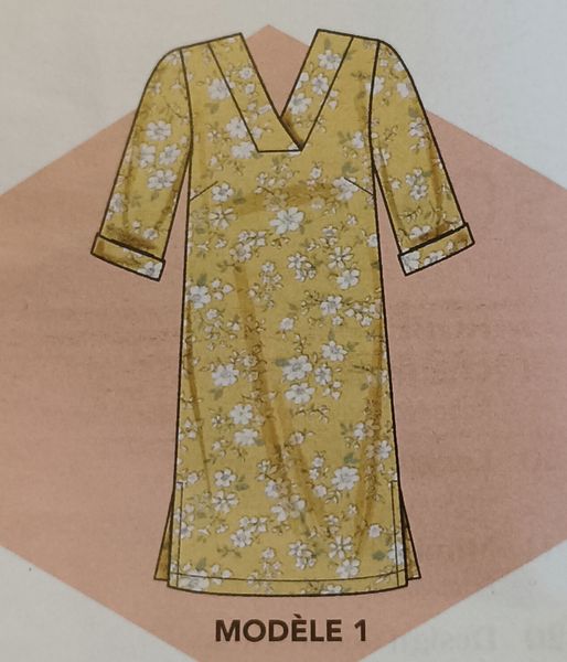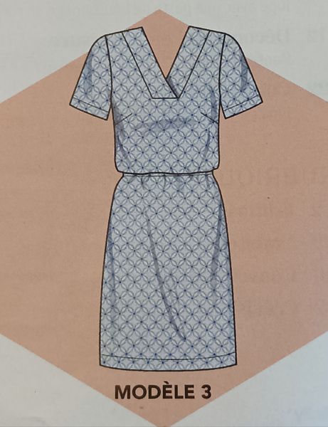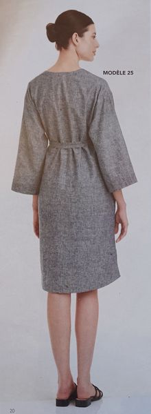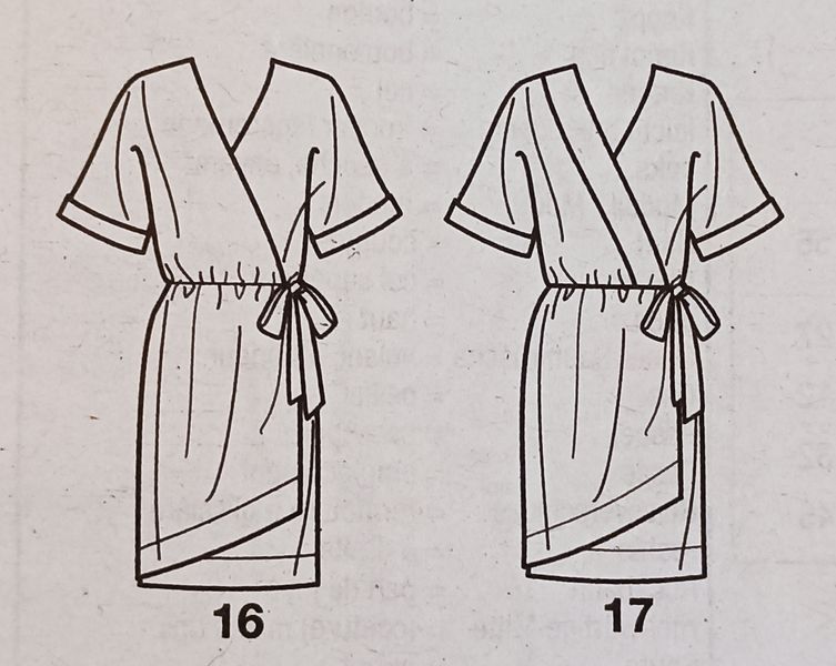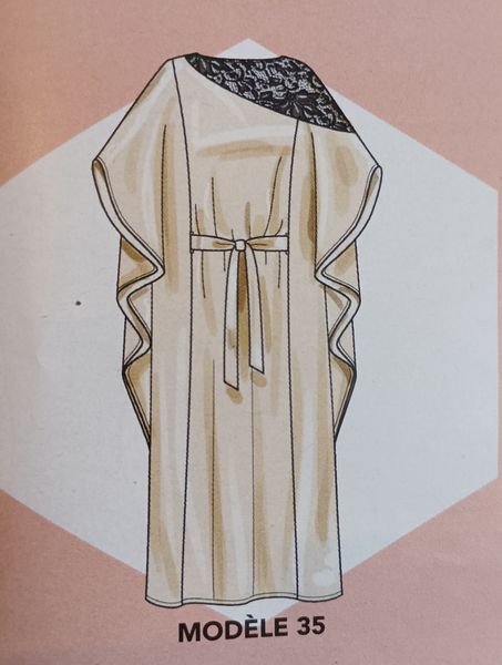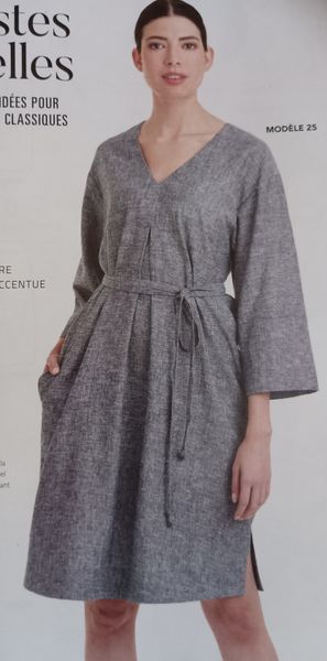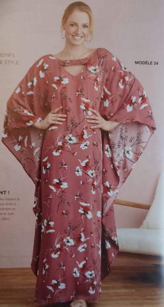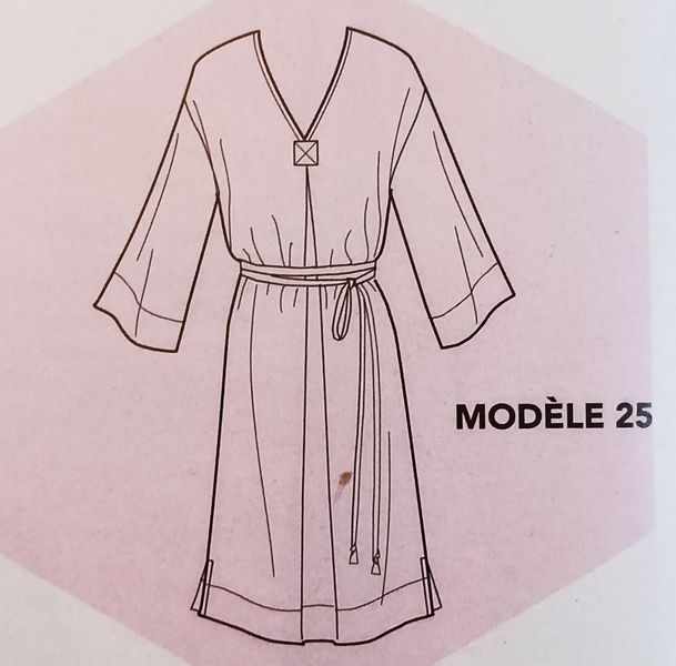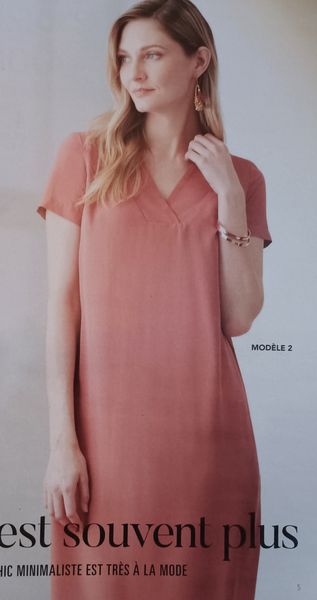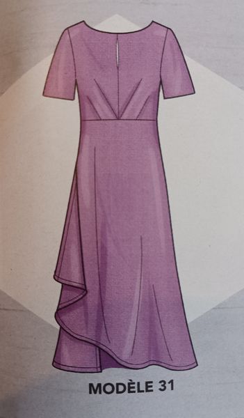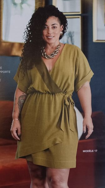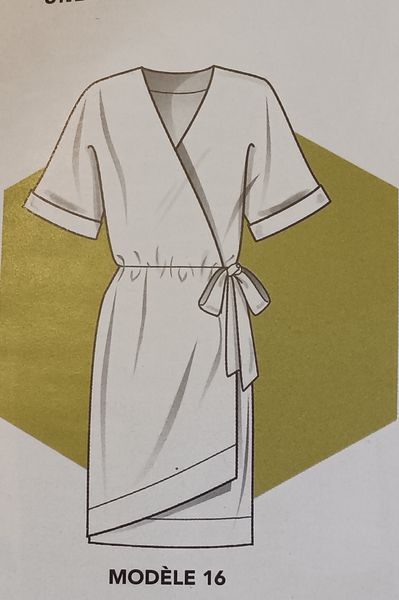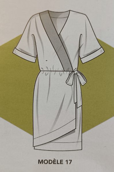 Vous aussi, vous aimez cette superbe robe de forme portefeuille. Elle possède des manches kimono avec revers. L’ourlet du pan asymétrique de la jupe est oblique. La version avec parement de couleur contrastante est superbe ! Notez que vous trouverez le patron dans les tailles 38, 40, 42, alors que le mannequin qui la présente porte à ma connaissance du 46…