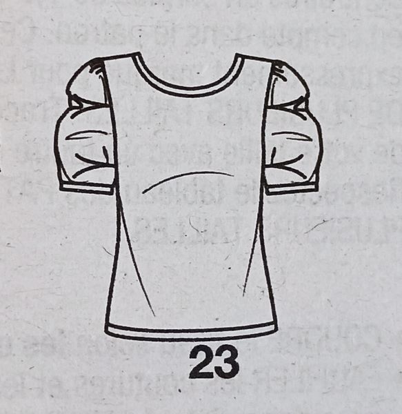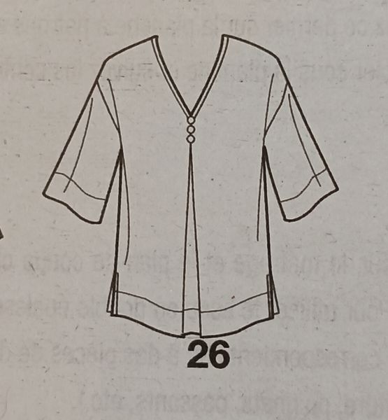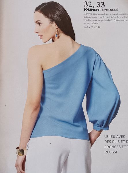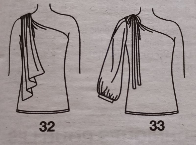 J’aime beaucoup cette tunique asymétrique elle aussi. Plus particulièrement la version avec une manche longue, l’épaule est ouverte et garnie de rubans à nouer.