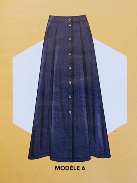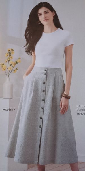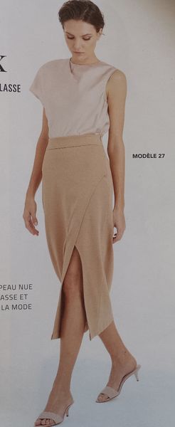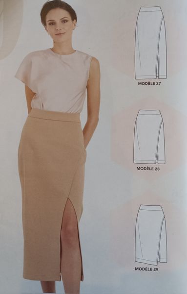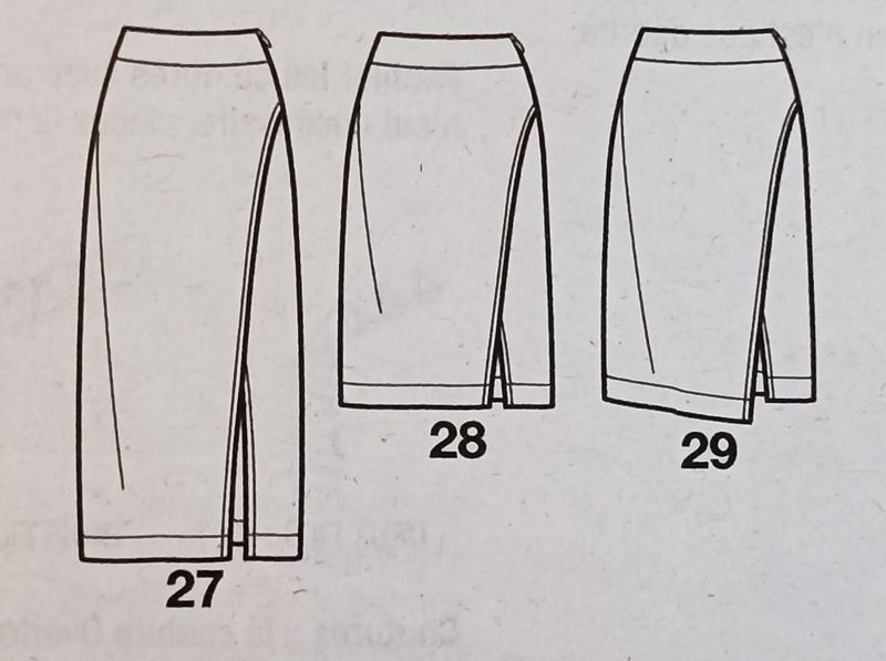 Voici une jupe qui se veut élégante et raffinée en long ou court. Nous avons une jupe droite avec découpes pour la fente. Pas de pinces à la taille , mais une parementure apparente. Elle se ferme à l’aide d’une fermeture à glissière sur le côté.