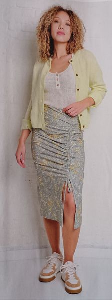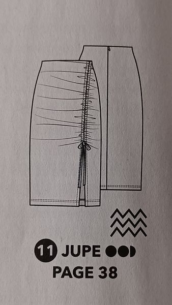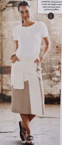 J’adore ce genre de jupe. Elle est réalisée dans un tissu extensible. Il s’agit d’une jupe longue crayon, avec une fente sur le devant. La hauteur de celle-ci peut être réglée à l’aide de liens sous coulisses.