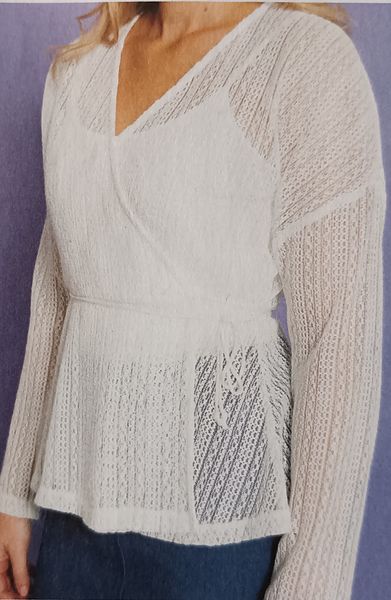 J’adore les cache-coeur, ce modèle est attrayant dans un tissu transparent façon dentelle. Ici, nous avons des manches longues, il se ferme sur le côté à l’aide d’un lien.