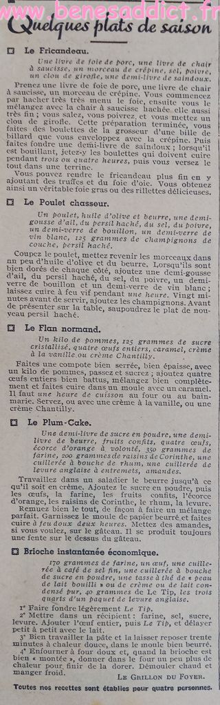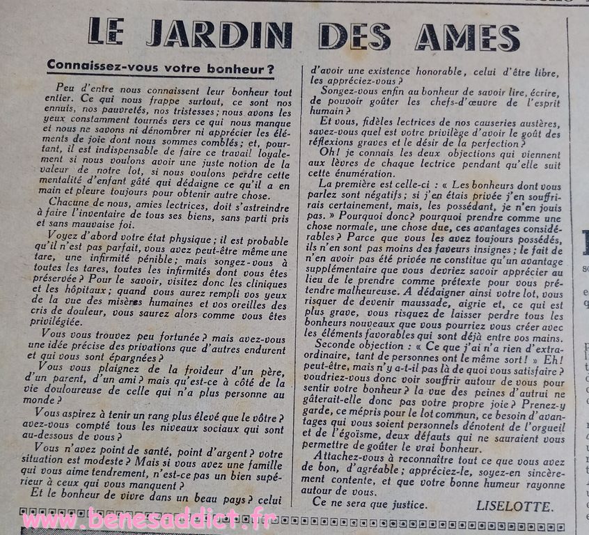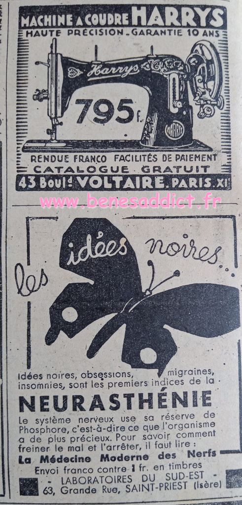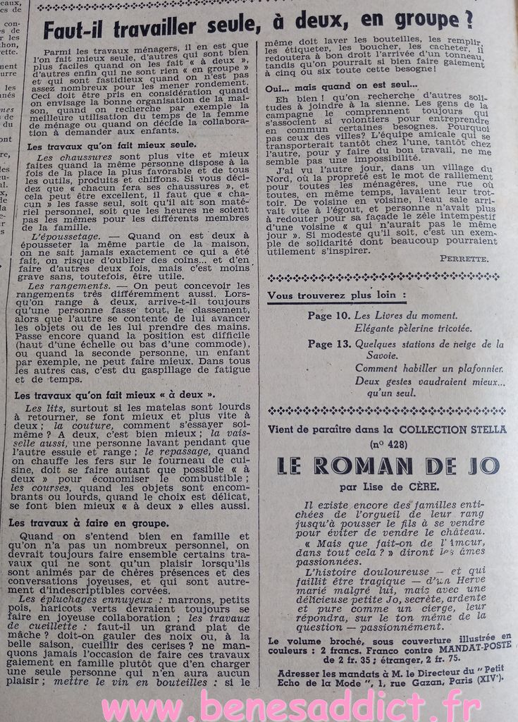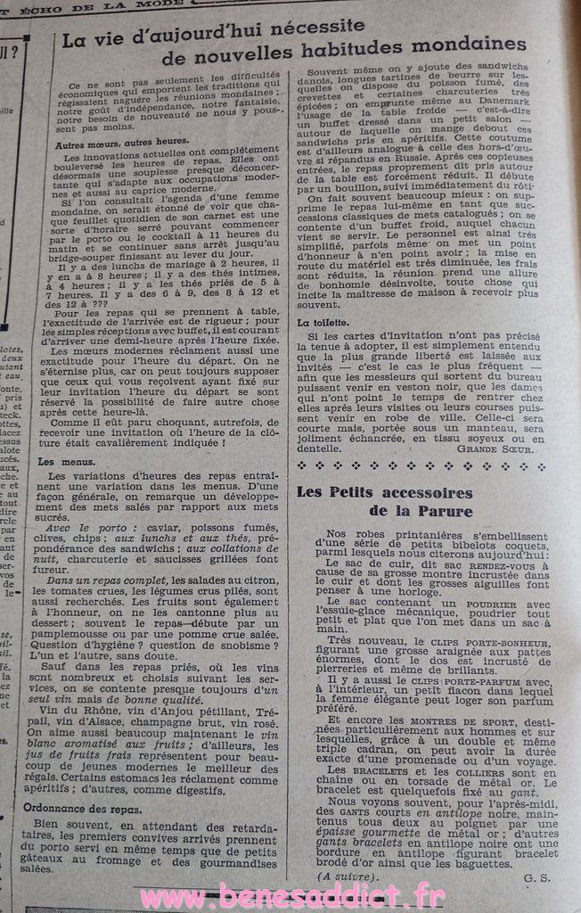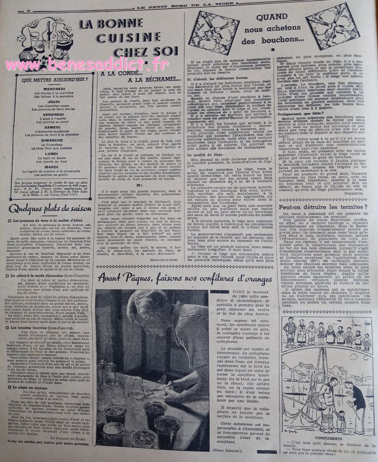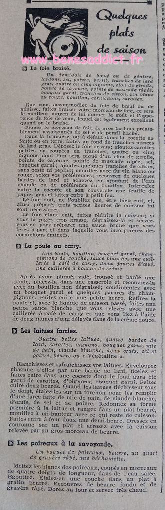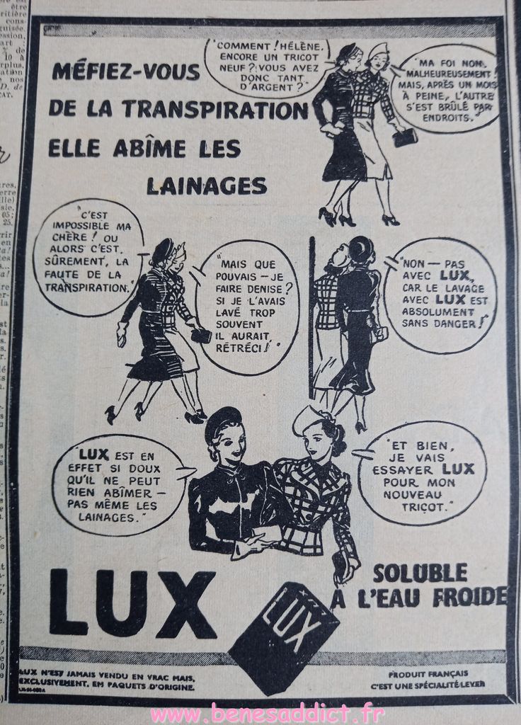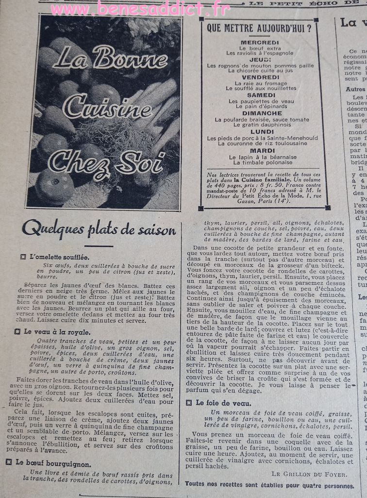 Bien sûr, vous retrouverez des réclames de toutes sortes, avec une prédilection sur la mode, mais aussi la femme et le regard posé sur elle. Pas toujours facile d’être une femme aujourd’hui, mais dans les années avant-guerre, je ne crois pas que c’était mieux. Les recettes de cuisine sont simples, car il y avait peu de moyens. Chaque achat était murement réfléchi, et on recyclait, mais aussi transformait