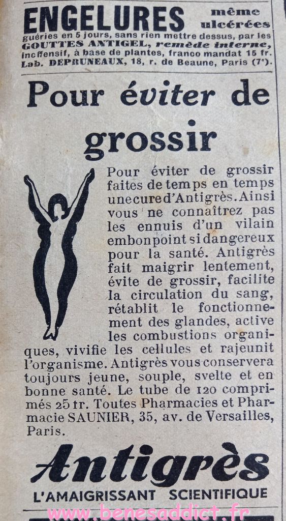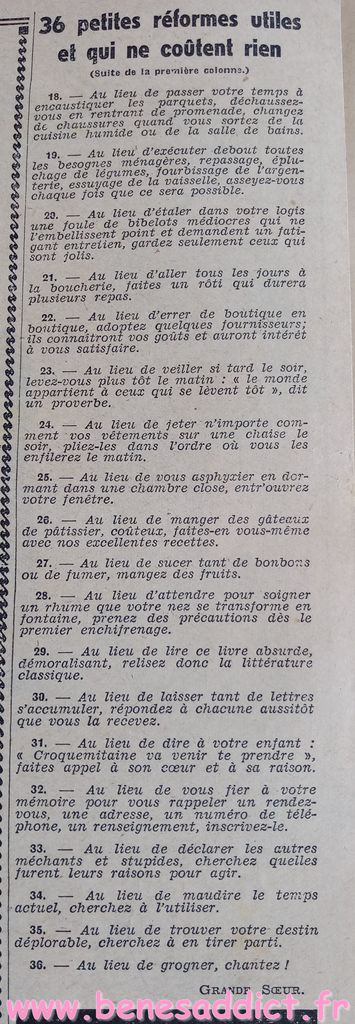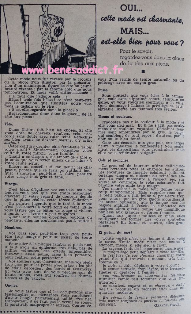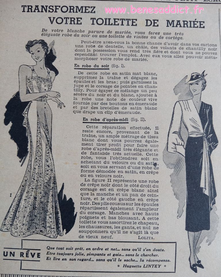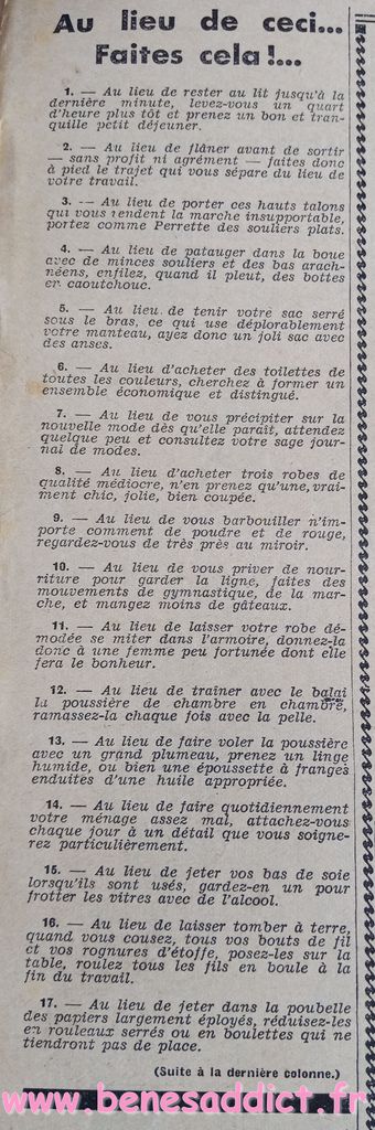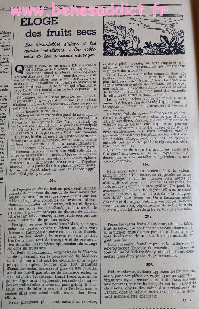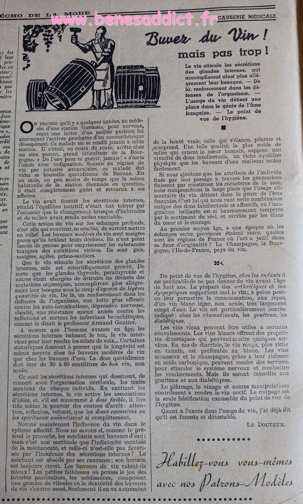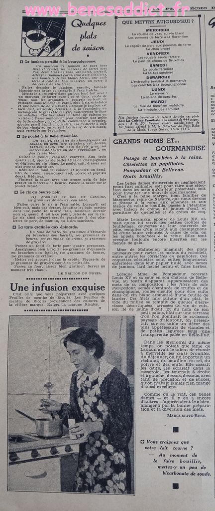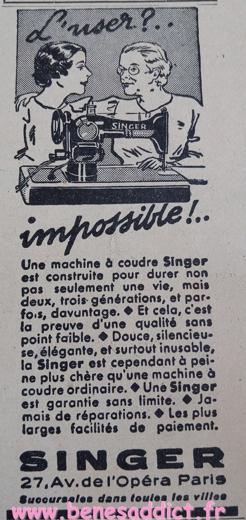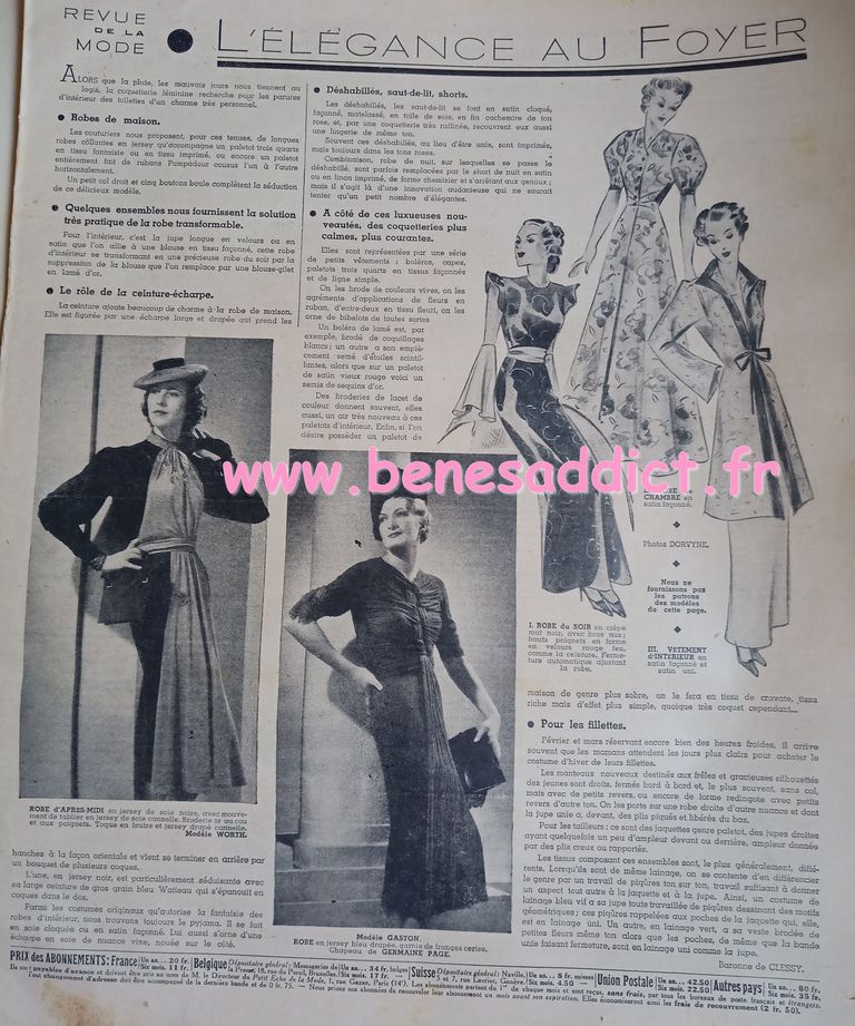 Bien sûr, vous retrouverez des réclames de toutes sortes, avec une prédilection sur la mode, mais aussi la femme et le regard posé sur elle. Pas toujours facile d’être une femme aujourd’hui, mais dans les années avant-guerre, je ne crois pas que c’était mieux. Les recettes de cuisine sont simples, car il y avait peu de moyens. Chaque achat était murement réfléchi, et on recyclait, mais aussi transformait