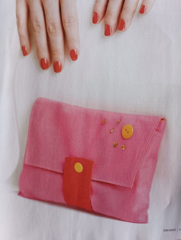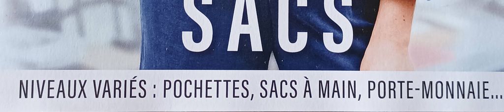 Ce bandeau nous informe que les patrons de la revue sont accessibles à tous les niveaux de couturières. Nous en apprenons un peu plus sur le contenu, avec des pochettes, sacs à main, porte-monnaie…
