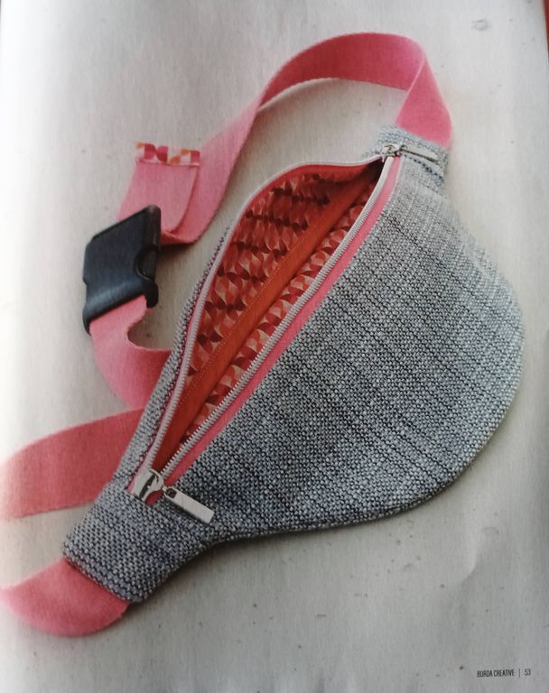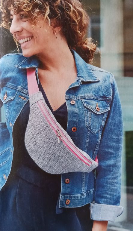 Voici un sac banane de deux couleurs gris et rose ! Pour le rigidifier un peu plus, les coutures intérieures sont bordées d’un biais, prenant la doublure. Il n’est pas trop grand, ni trop épais. Juste ce qu’il faut selon moi.