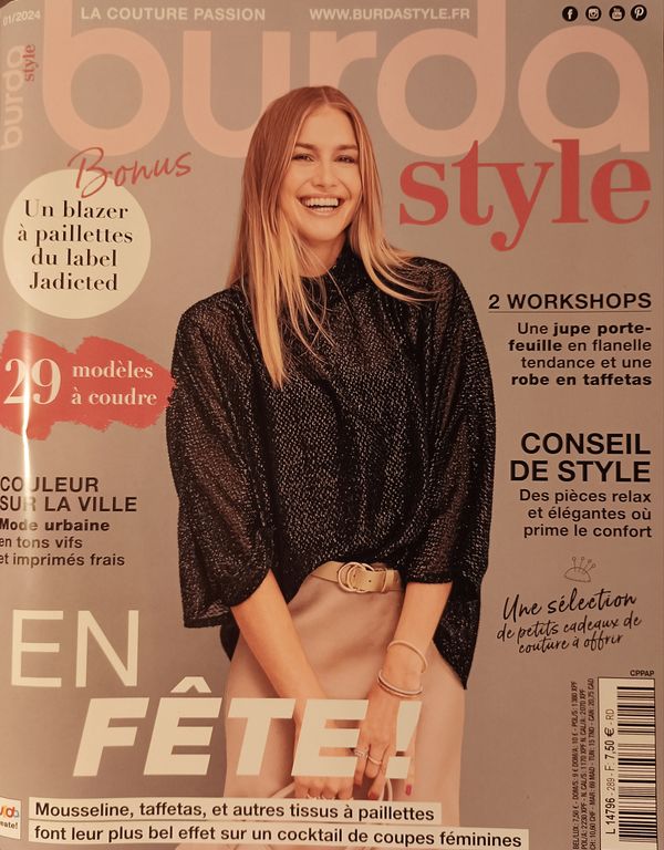 Bonjour les créatives ! Dernière revue de presse avant Noël, alors mettons la couture en Fête. Je sais que vous êtes nombreuses à coudre jusqu’au dernier moment pour que les cadeaux soient sous le sapin ! Je vous dis un grand BRAVO. Le magazine du jour est Burda Style, il s’agit du premier numéro pour l’année 2024.