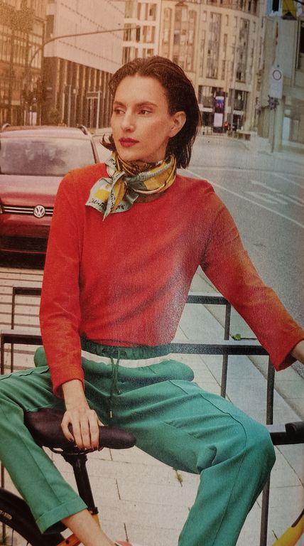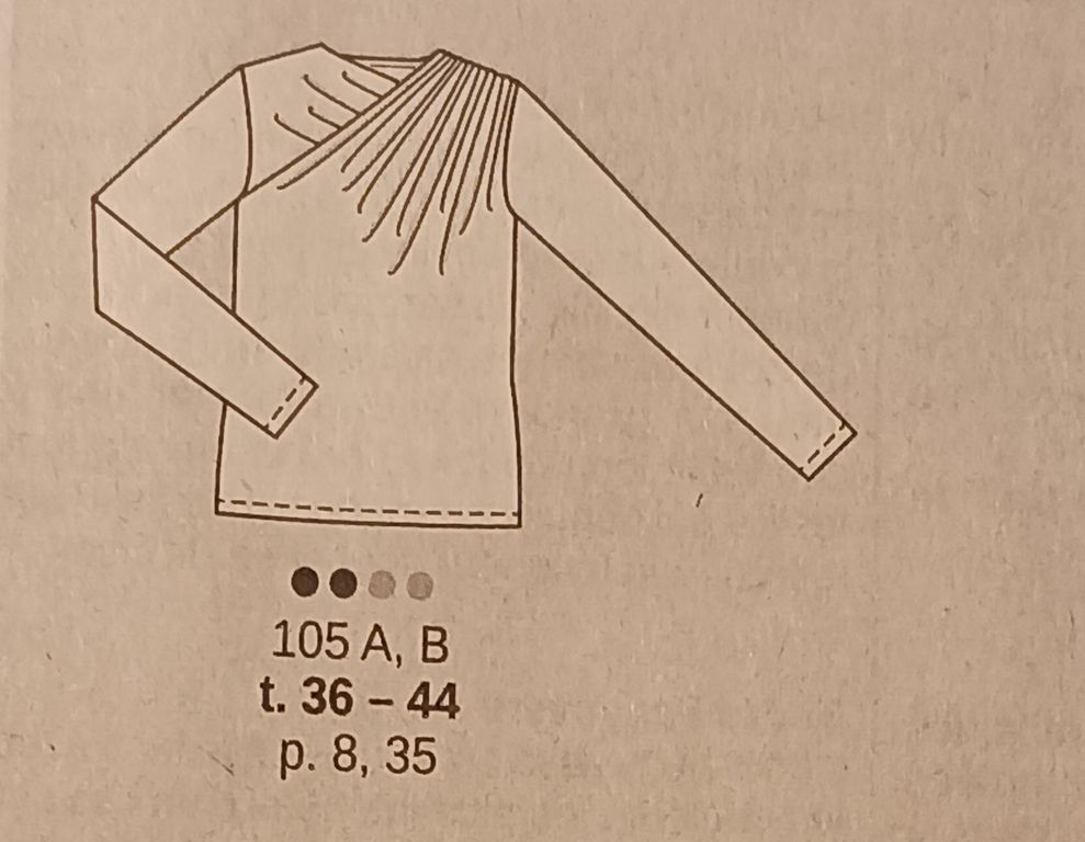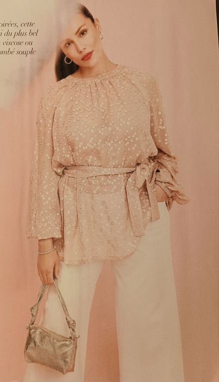 J’aime le jeu des drapés sur les épaules de ce haut. Ils subliment une pièce basique comme ici. Les manches sont longues. Il est dommage que l’encolure soit si proche du cou.