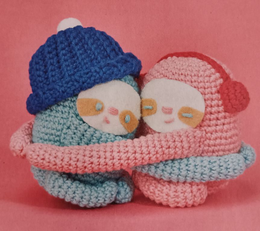 Ces petits amigurumis de la rubrique d’un crochet à l’autre symbolisent la Saint-Valentin. Je les trouve tout mignons, que ce soit le lapin au grand cœur, ou le couple de paresseux en train de se faire un gros câlin. Le choix du rose et du bleu ajoute une touche de douceur.