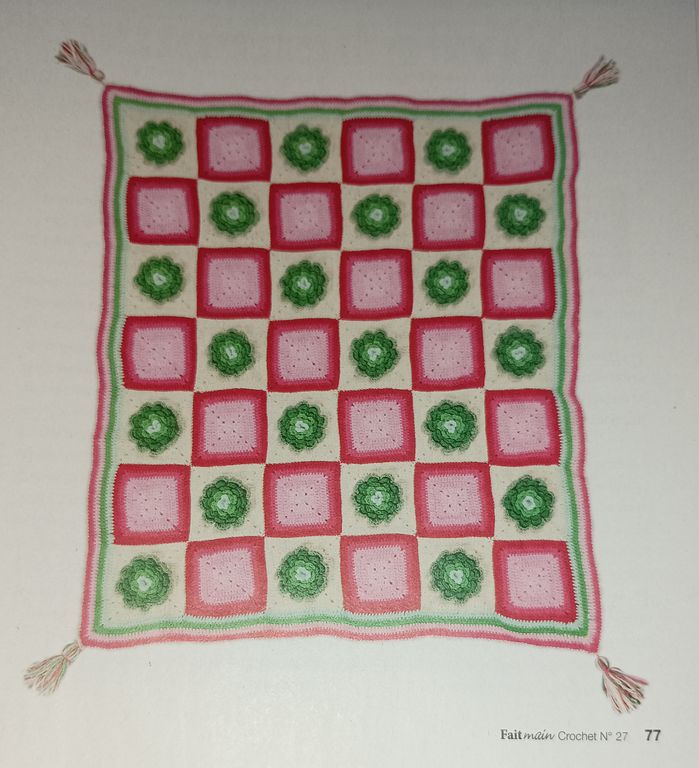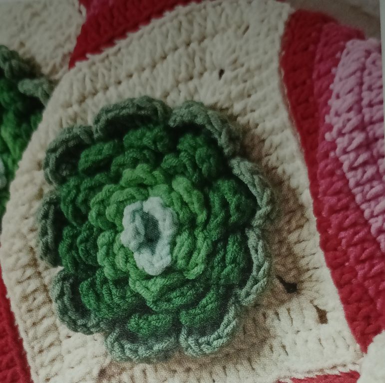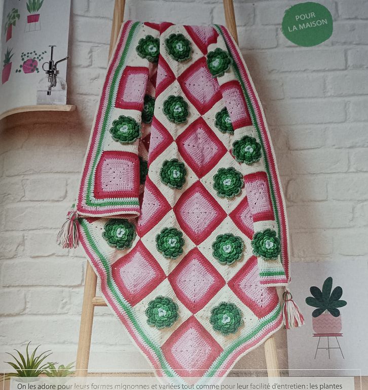 Cette couverture à un parfum de nostalgie pour moi. En effet, enfant, je dormais souvent chez mes grand-parents et je me rappelle les nombreux coussins et couvertures au crochet. Les couleurs étaient très typées années 70. Ici la composition judicieuse des couleurs avec les motifs apportée de la profondeur à la couverture. Les succulentes ont plusieurs nuances de verts !