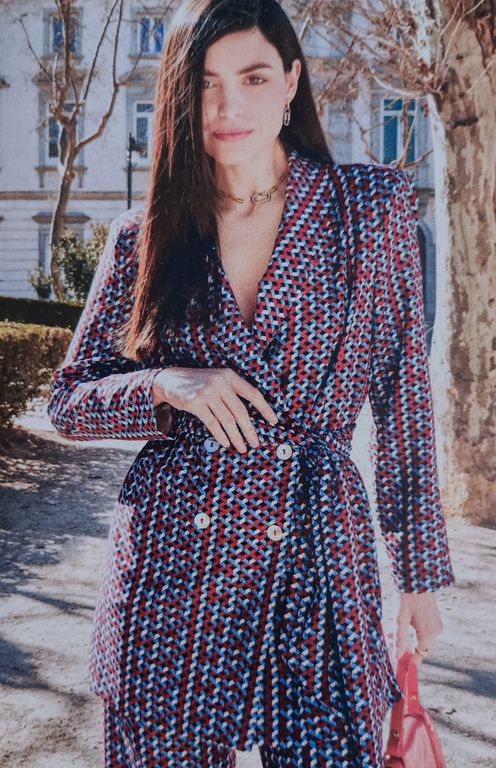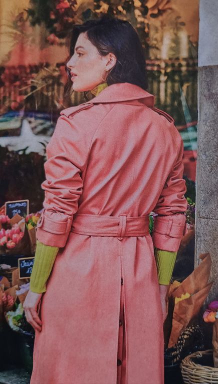 J’adore cette robe, couleur rouille en plus estampillée couture facile. Elle est simple et droite. Pour la fermer, pas de bouton, mais une ceinture. Les pans du devant sont croisés ce qui permet de mettre en valeur le col châle et de jouer sur la profondeur de l’encolure. Les manches sont longues et larges.