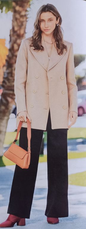 Ici pas de surprises, c’est une tenue en grandes tailles composée d’un gilet de tailleur. Il possède des découpes et des poches passepoilées. Le pantalon est, lui aussi, classique avec une braguette et des plis. Pas trop large, juste comme il faut.