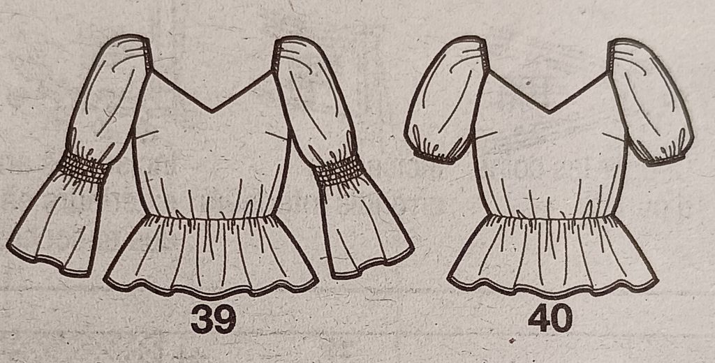 J’ai dans mon armoire le modèle 39, à savoir une blouse avec des manches ballons, resserrée par des smocks d’élastiques à mi-hauteur. Ici l’encolure est en V, avec les épaules élastiquées, tout comme la taille pour résorber l’ampleur et former une basque. J’aime beaucoup la version à manches courtes aussi.