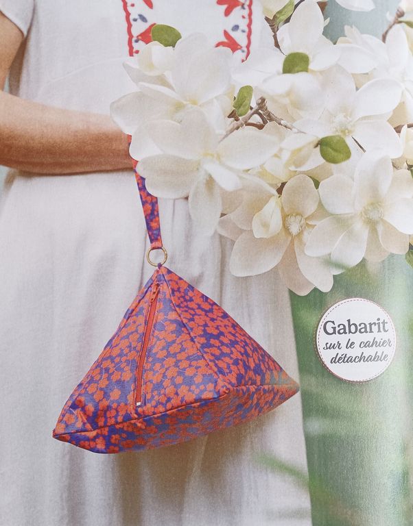 J’aime beaucoup ce sac, c’est même un gros coup de cœur. Sa forme en pyramide ou berlingot le rend très original. Il se porte avec l’anse passée autour du poignet.