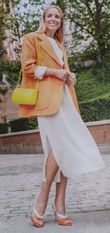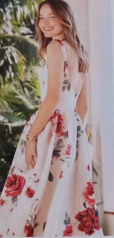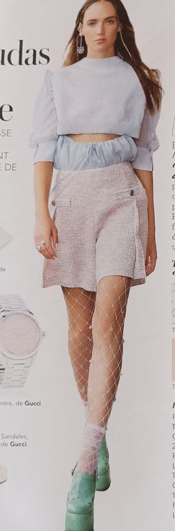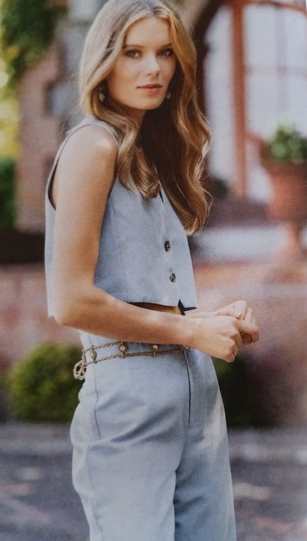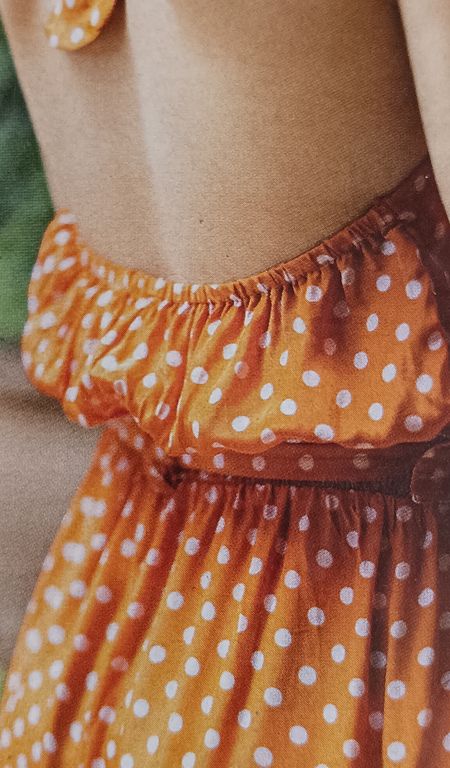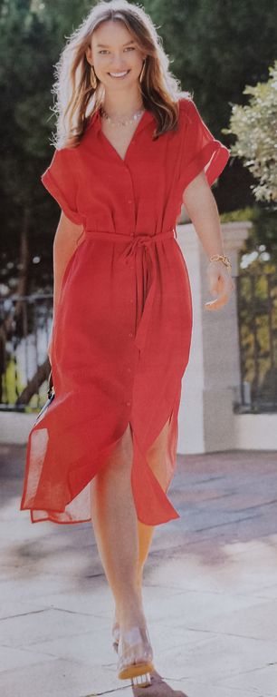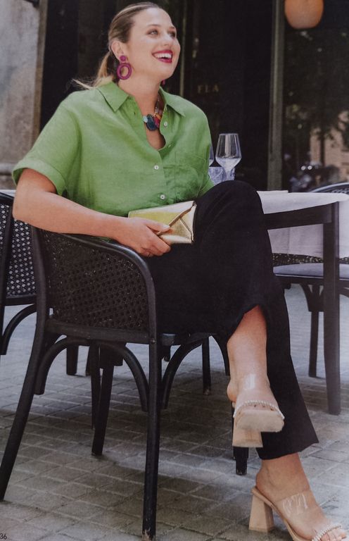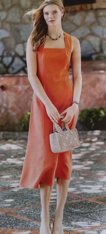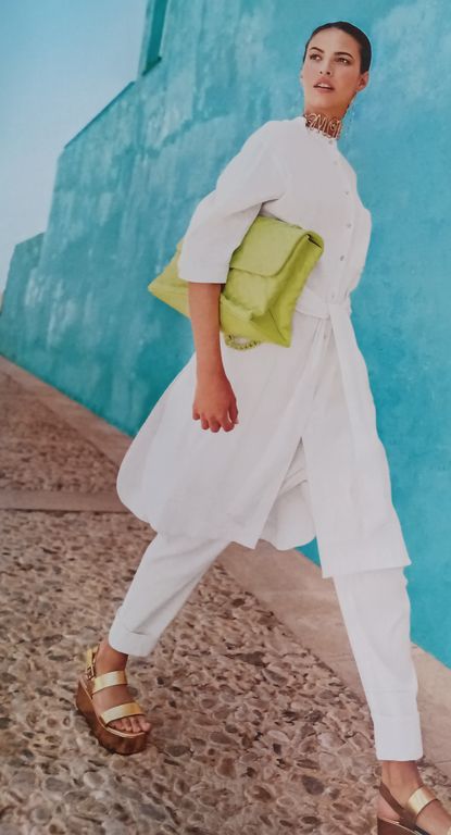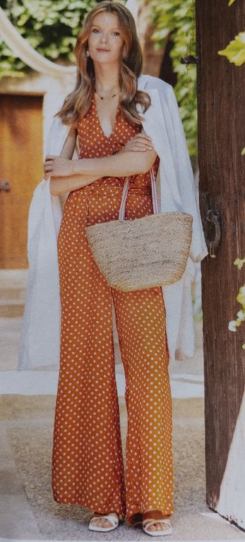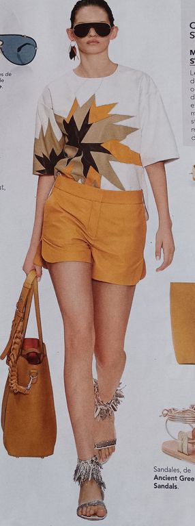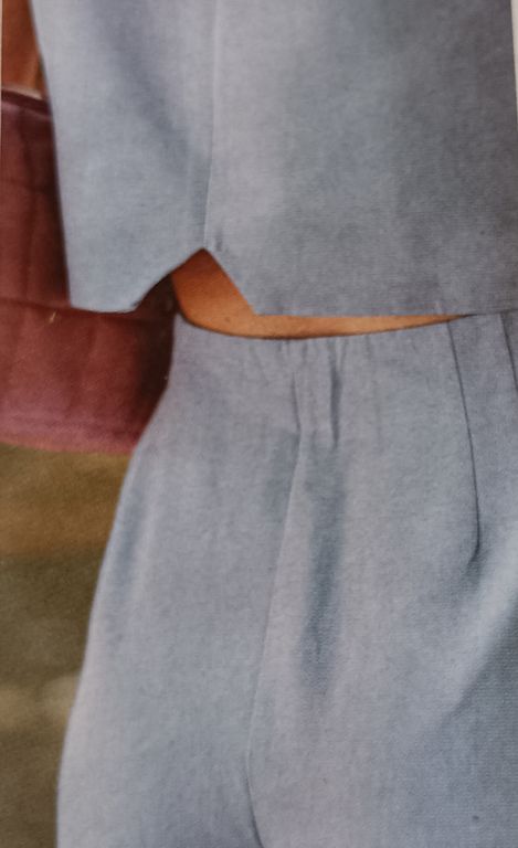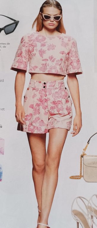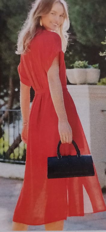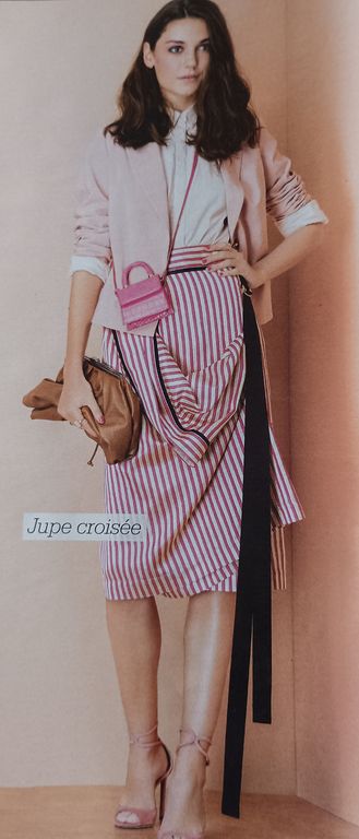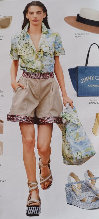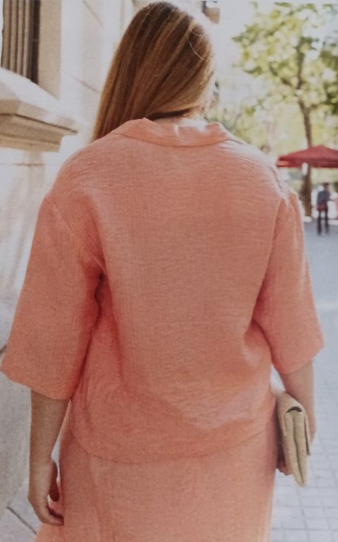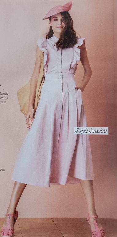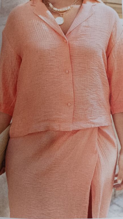 Que pensez-vous de cet ensemble composé d’une chemise et d’une jupe. On a presque l’illusion dune robe. La chemise est courte, légèrement sous la ligne de taille. Elle possède un grand col ouvert. La jupe me fait penser aux paréos que l’on noue en sortant de la plage. Une longue fente sur la jambe sublime la tenue.