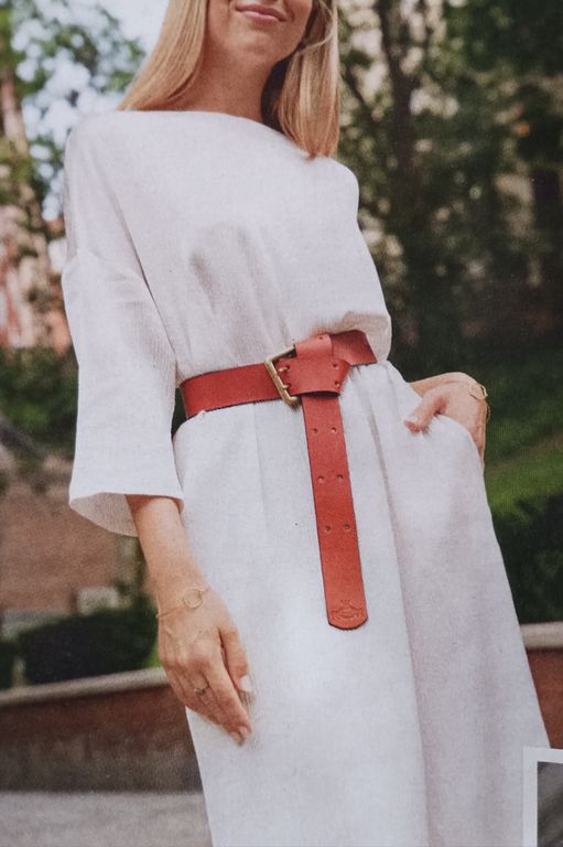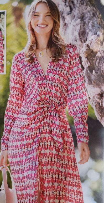 J’adore les robes portefeuille, selon moi, c’est le modèle parfait pour toutes les silhouettes. Son encolure est en V. Les manches sont longues. Les pans sont attachés sur le côté avec un anneau métallique.