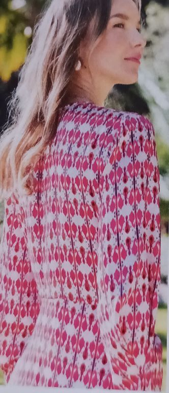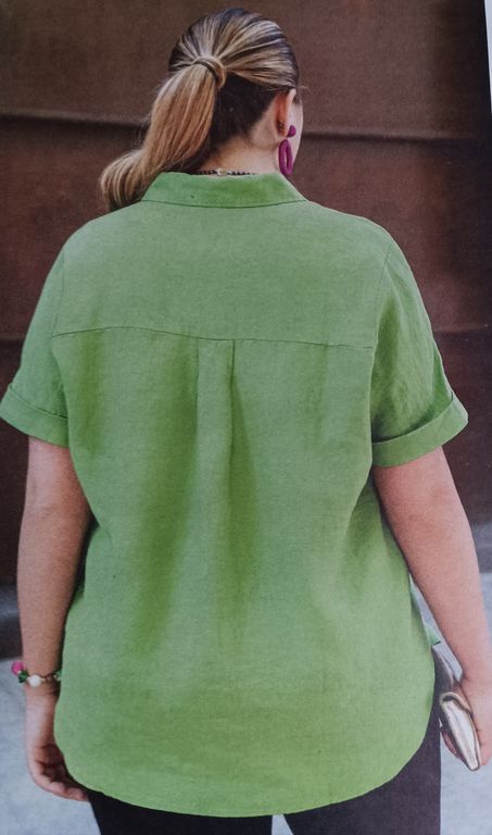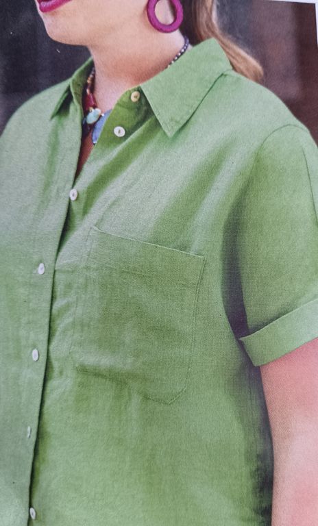Ce modèle de chemise est très actuel. En effet, vous êtes nombreuse à les porter versions courtes, en les pliant ou drapant. Cette version est plissée et drapée au-dessus de la taille. Les boutons sont sous patte de boutonnage.