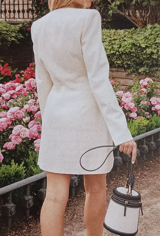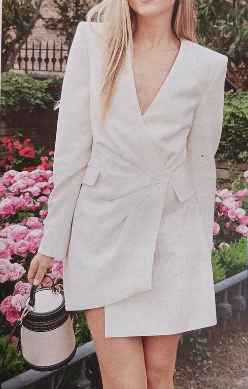Cette robe blazer sort de l’ordinaire. Encore une version portefeuille pour le moins très élégante. Le devant est asymétrique avec des pinces transversales qui apportent du mouvement. Les manches sont longues.