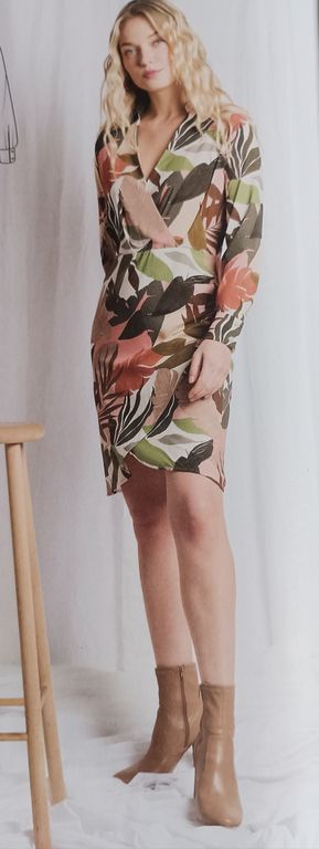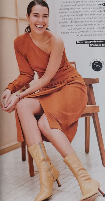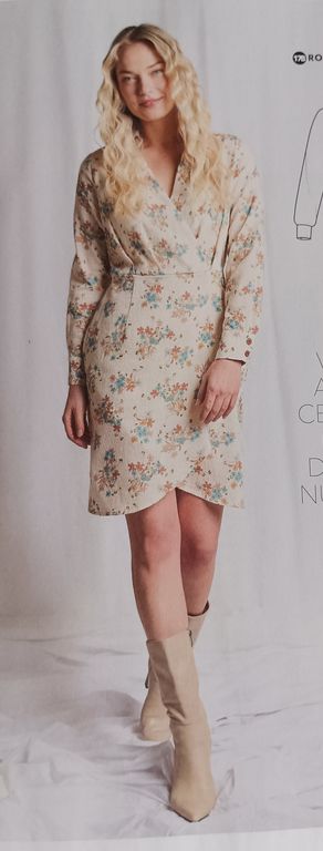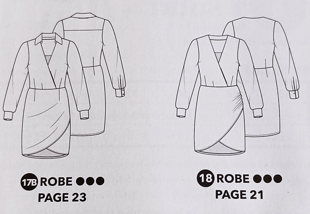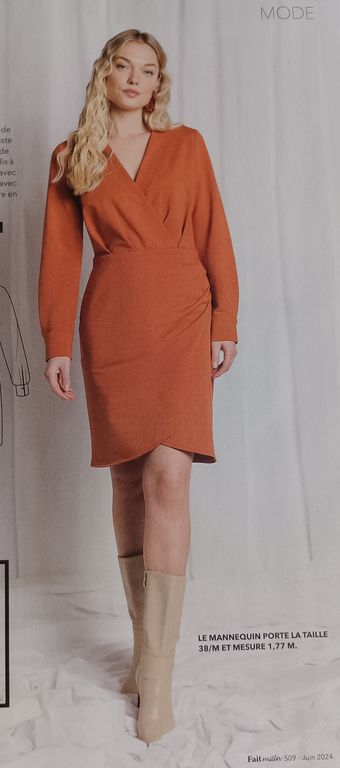 Dernier coup de cœur pour femme. Pour cette robe portefeuille. La jupe peut être plissée sur le côté ou pas. Ses pans sont arrondis. Le corsage est ajusté à l’aide de pinces, son encolure est en V avec ou sans petit col. Ce modèle se prêterait parfaitement à des manches courtes.