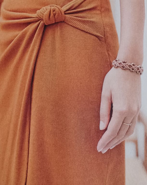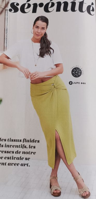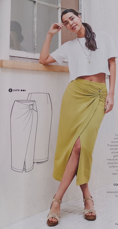 J’adore cette jupe croisée. Elle est asymétrique avec un pan noué ou stylisé avec une boucle sur le côté. La ceinture est sous enforme, et se ferme à l’aide d’une fermeture à glissière sur le côté.