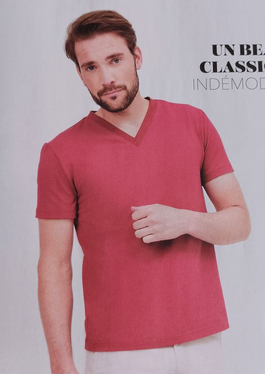 Les t-shirts… C’est ce que mettent mon mari et mon fils tous les jours, mais en version col rond. Ici, en col en V, je trouve ça plus élégant. Il possède des manches courtes.