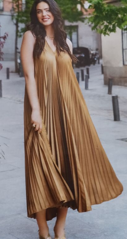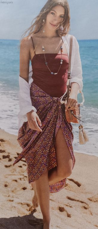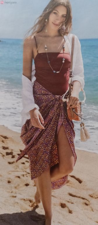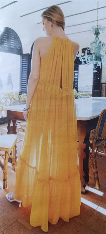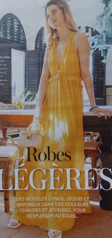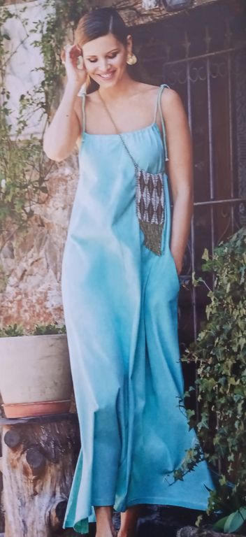 L’été, quand je suis en vacances, j’aime avoir une robe à enfiler par-dessus le maillot de bain. Ce modèle me fait penser aux tenues des romaines comme on peut les voir dans les films. Sans manches, avec un profond décolleté en V sur le devant, la robe longue possède un large volant.
